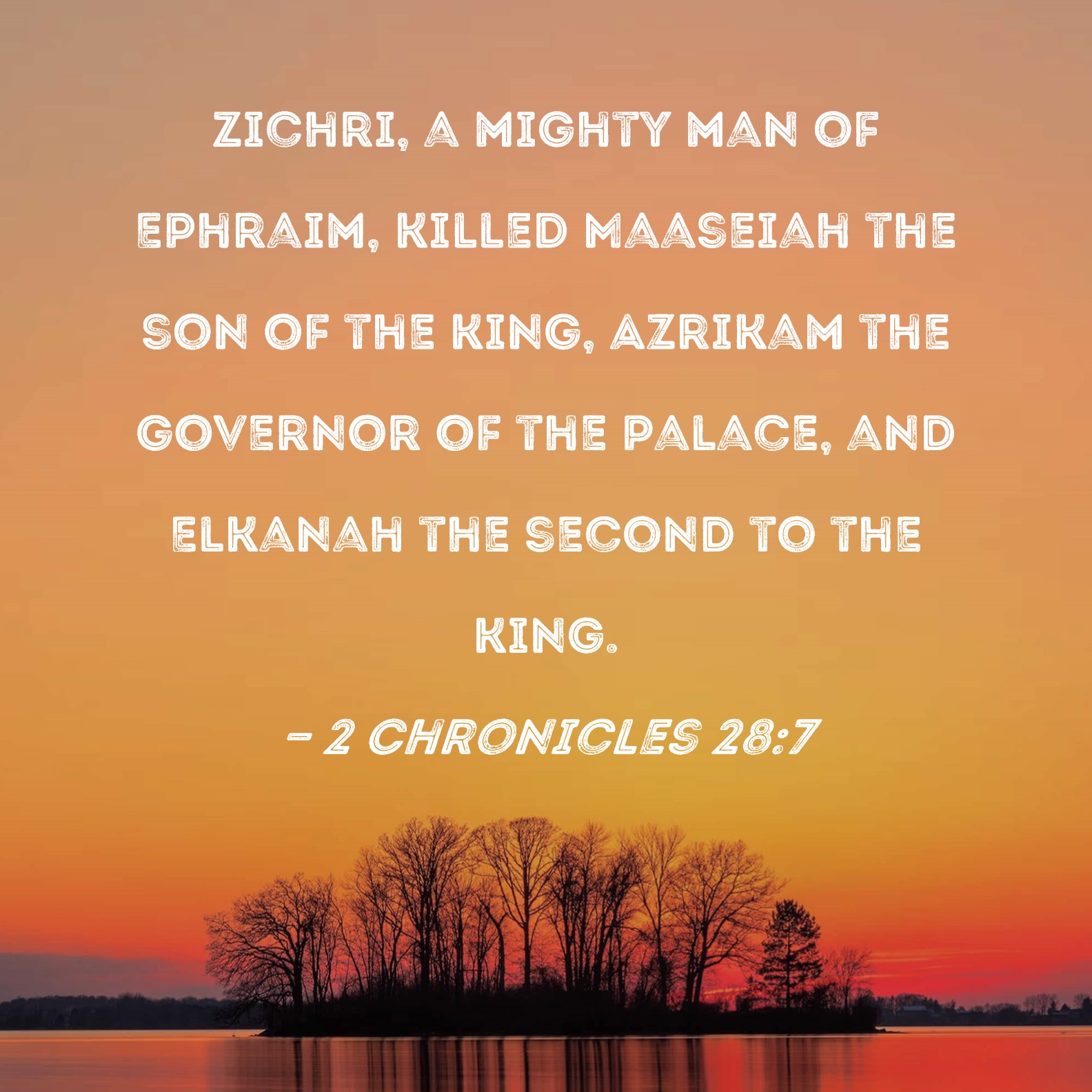 2 Chronicles 28:7 Zichri, a mighty man of Ephraim, killed Maaseiah the son of the king, Azrikam the governor of the palace, and Elkanah the second to the king.