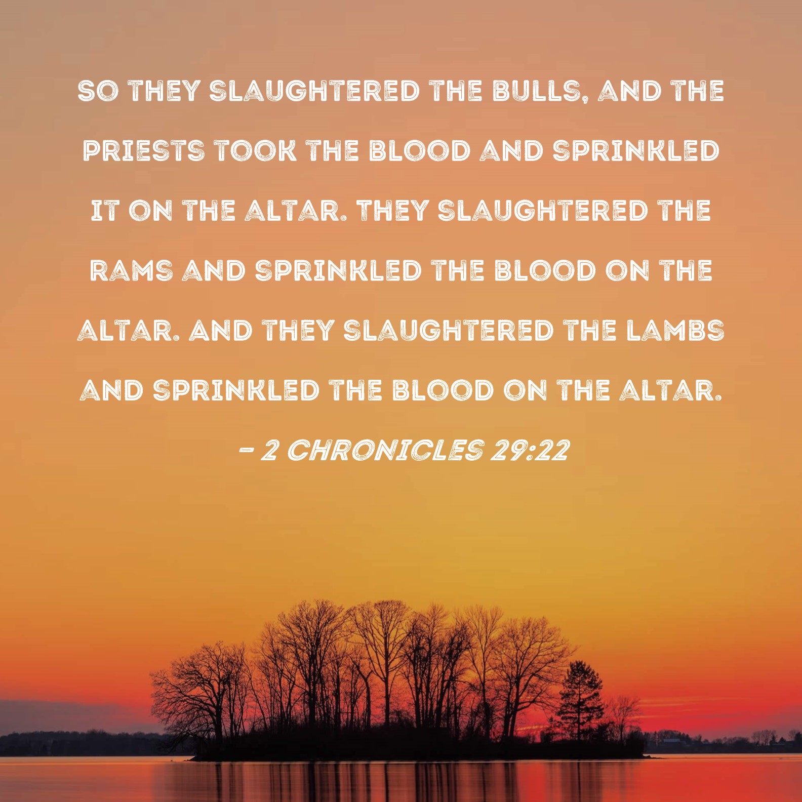 2 Chronicles 29:22 So they slaughtered the bulls, and the priests took the blood and sprinkled it on the altar. They slaughtered the rams and sprinkled the blood on the altar. And they slaughtered the lambs and sprinkled the blood on the altar.