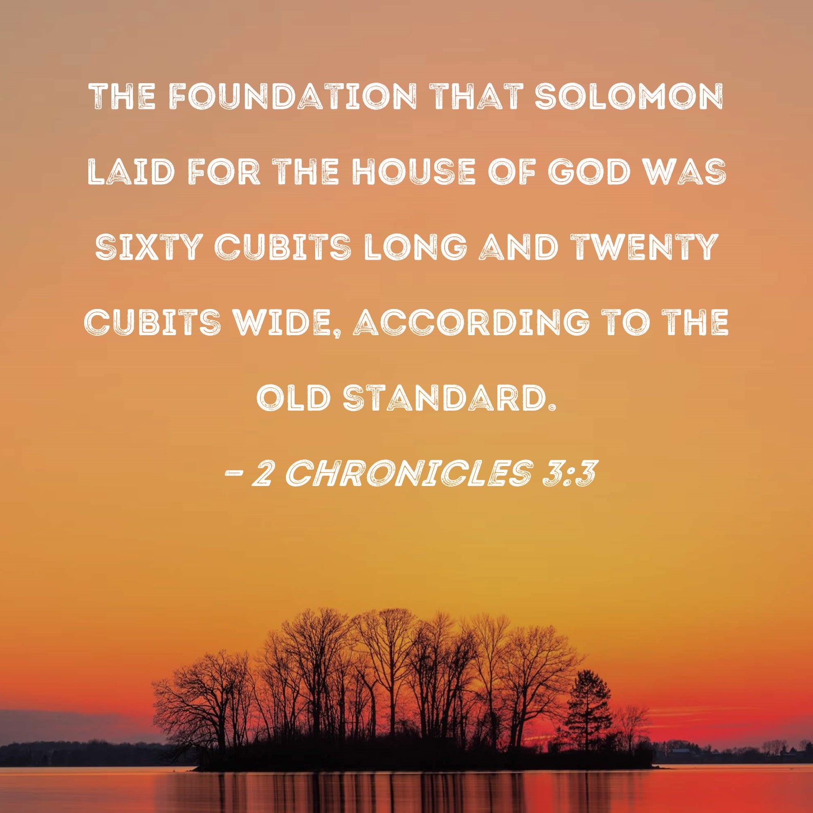 2 Chronicles 3:3 The foundation that Solomon laid for the house of God was sixty cubits long and twenty cubits wide, according to the old standard.