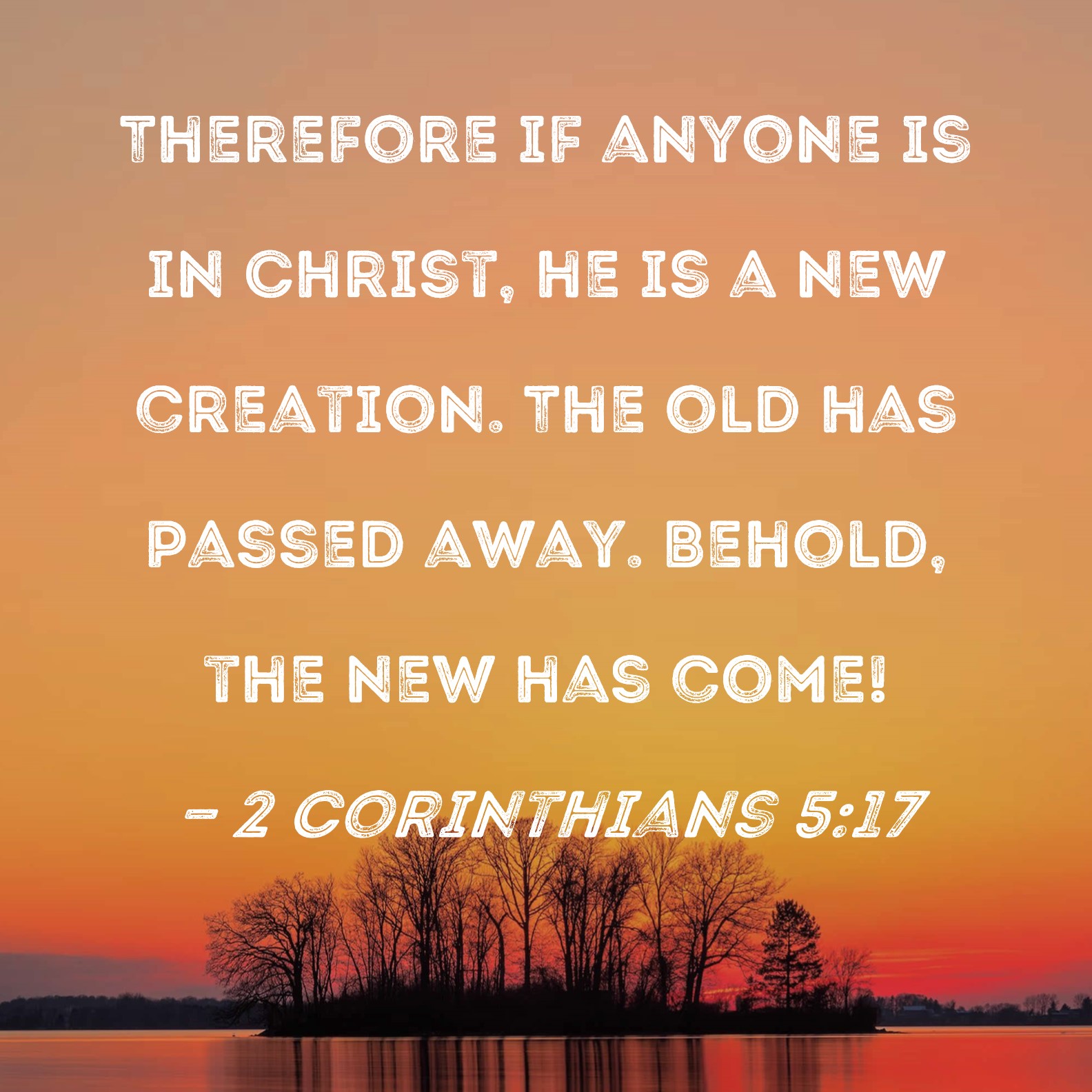 BSB: Therefore if anyone is in Christ, he is a new creation. The old has passed away. Behold, the new has come! KJV: Therefore if any man be in Christ, he is a new creature: old things are passed away; behold, all things are become new. DRB: If then any be in Christ a new creature, the old things are passed away, behold all things are made new. DBT: So if any one be in Christ, there is a new creation; the old things have passed away; behold all things have become new: ERV: Wherefore if any man is in Christ, he is a new creature: the old things are passed away; behold, they are become new. WBT: Therefore, if any man is in Christ, he is a new creature: old things have passed away; behold, all things have become new. WEB: Therefore if anyone is in Christ, he is a new creation. The old things have passed away. Behold, all things have become new. YLT: so that if any one is in Christ — he is a new creature; the old things did pass away, lo, become new have the all things.Links 2 Corinthians 5:17 NIV • 2 Corinthians 5:17 NLT • 2 Corinthians 5:17 ESV • 2 Corinthians 5:17 NASB • 2 Corinthians 5:17 KJV • 2 Corinthians 5:17 Interlinear • 2 Corinthians 5:17 Commentaries • 2 Corinthians 5:17 Parallel Texts • 2 Corinthians 5:17 Bible Apps • 2 Corinthians 5:17 Parallel • Bible Hub |