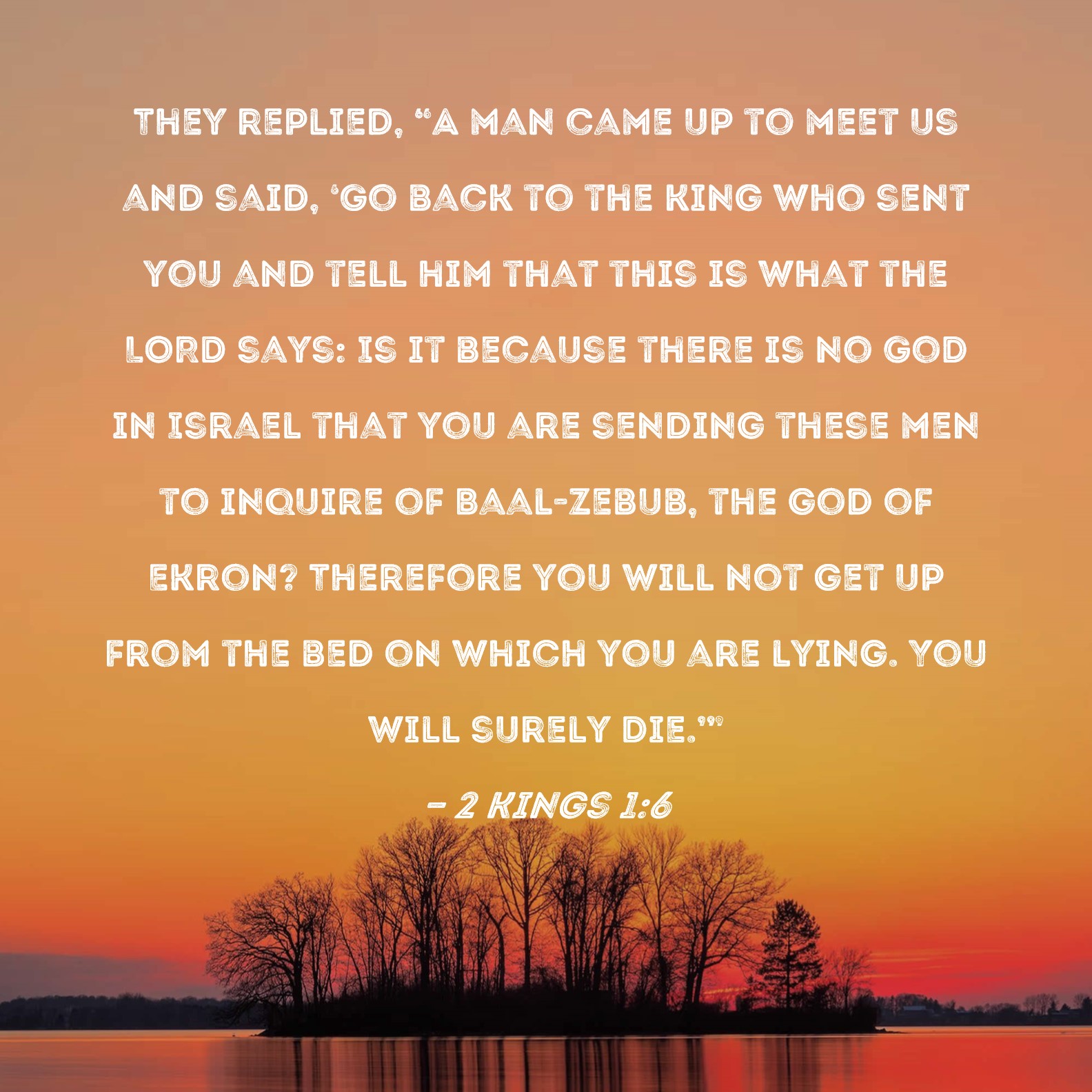 2 Kings 1:6 They replied, "A man came up to meet us and said, 'Go back to the king who sent you and tell him that this is what the LORD says: Is it because there is no God in Israel that you are sending these men to inquire of Baal-zebub, the god of Ekron? Therefore you will not get up from the bed on which you are lying. You will surely die.'"