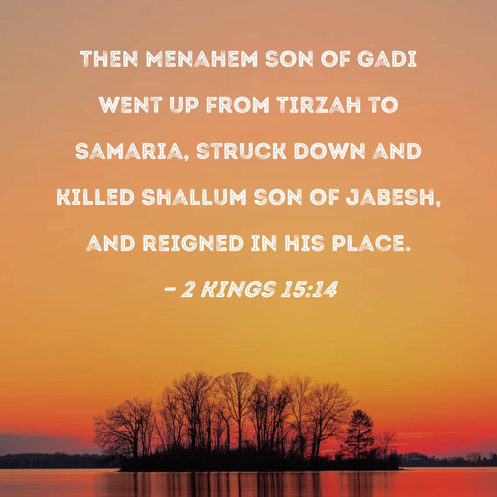 2 Kings 15:14 Then Menahem son of Gadi went up from Tirzah to Samaria, struck down and killed Shallum son of Jabesh, and reigned in his place.