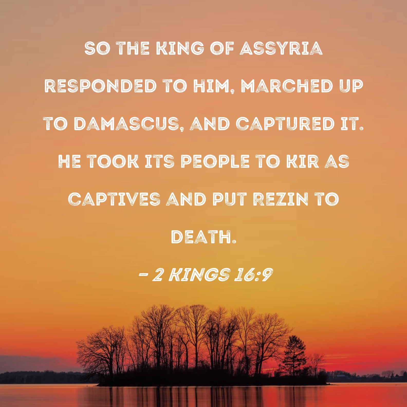 2 Kings 16:9 So the king of Assyria responded to him, marched up to Damascus, and captured it. He took its people to Kir as captives and put Rezin to death.