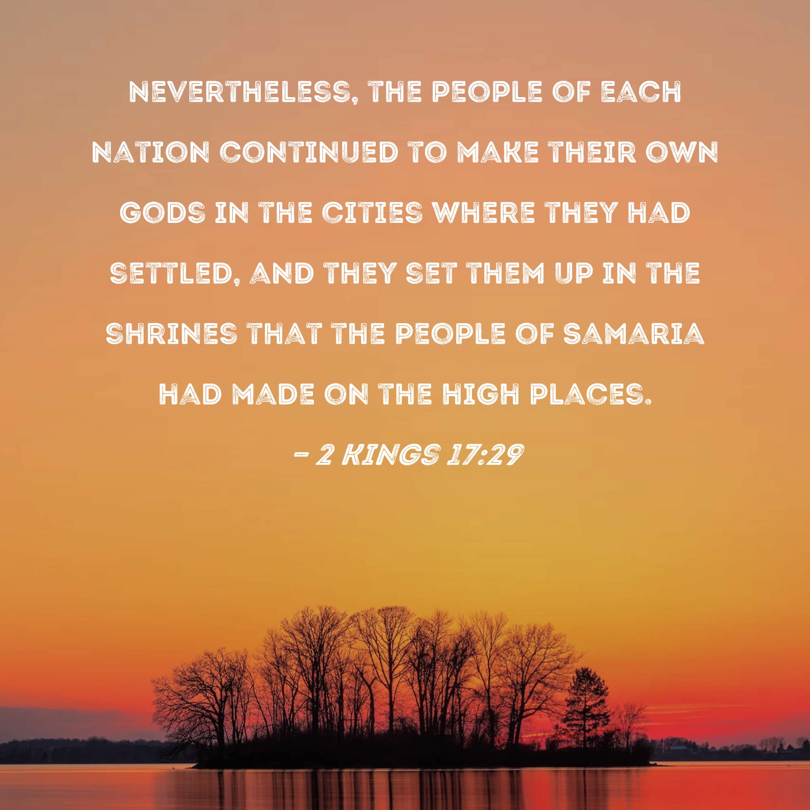 2 Kings 17:29 Nevertheless, the people of each nation continued to make their own gods in the cities where they had settled, and they set them up in the shrines that the people of Samaria had made on the high places.