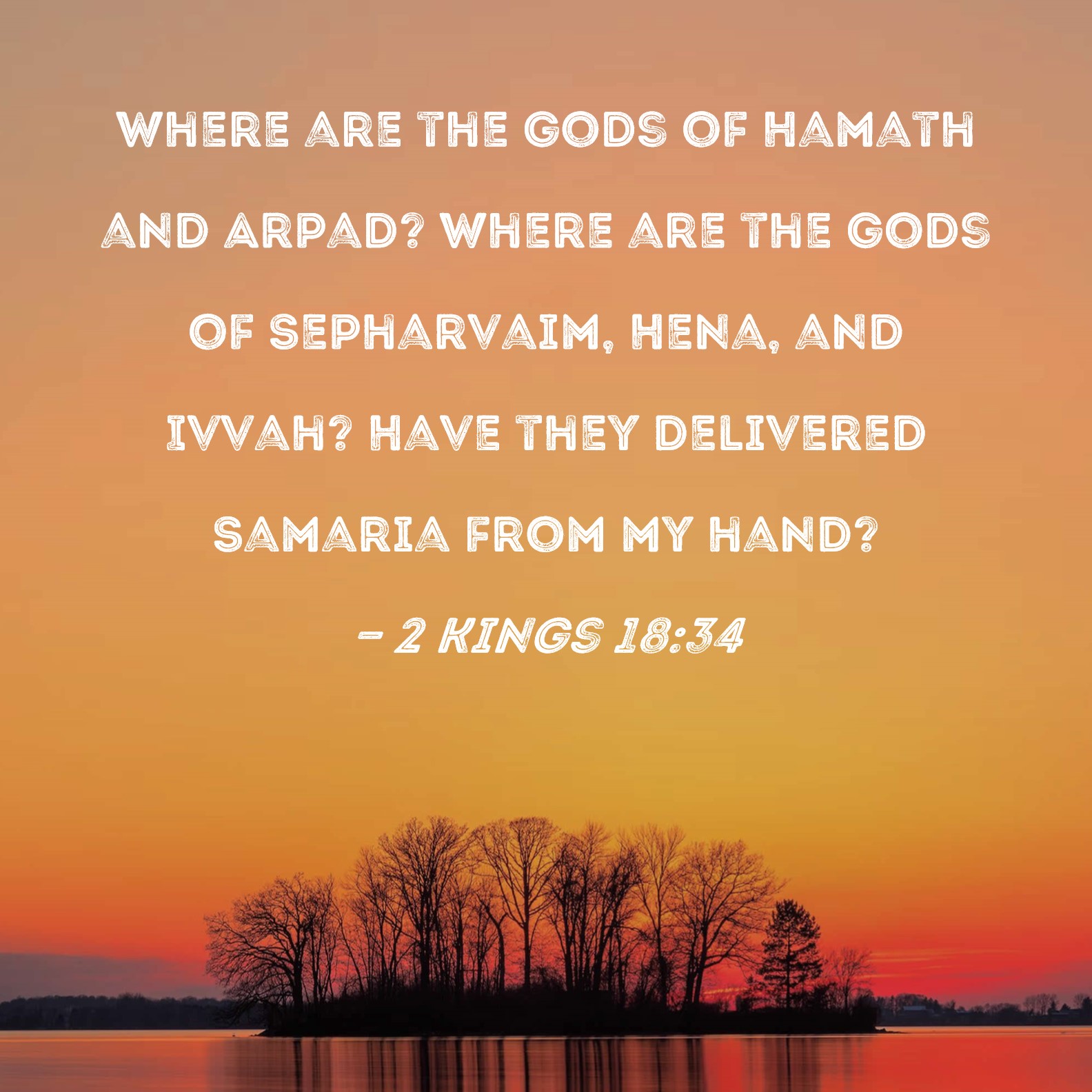 2 Kings 18:34 Where are the gods of Hamath and Arpad? Where are the gods of Sepharvaim, Hena, and Ivvah? Have they delivered Samaria from my hand?