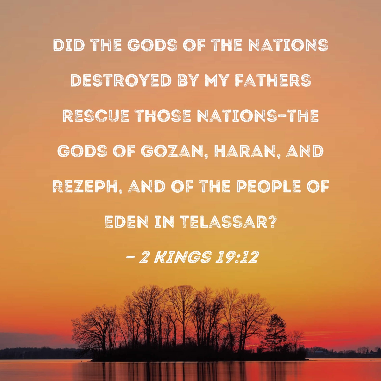 2 Kings 19:12 Did the gods of the nations destroyed by my fathers rescue those nations--the gods of Gozan, Haran, and Rezeph, and of the people of Eden in Telassar?
