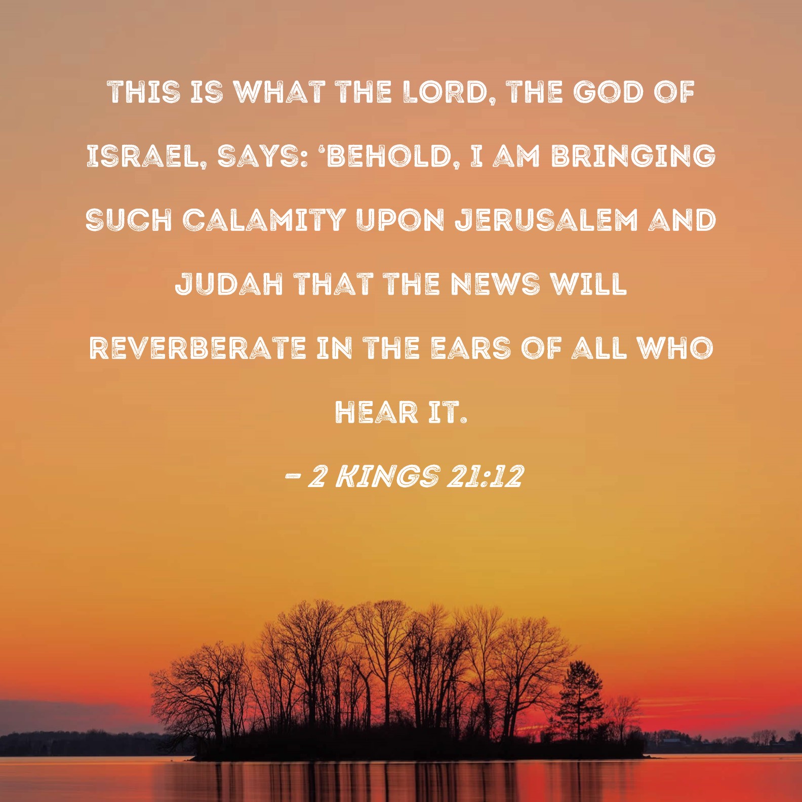 2 Kings 21:12 this is what the LORD, the God of Israel, says: 'Behold, I am bringing such calamity upon Jerusalem and Judah that the news will reverberate in the ears of all who hear it.