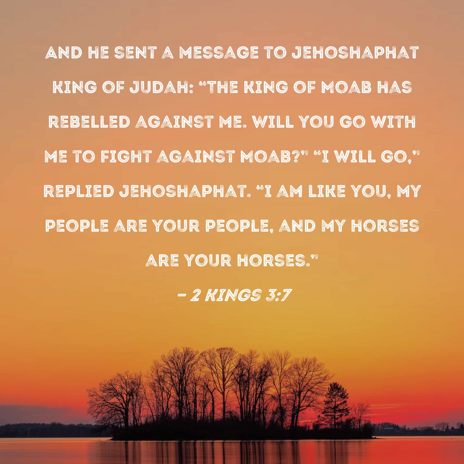 2 Kings 3:7 And he sent a message to Jehoshaphat king of Judah: "The king of Moab has rebelled against me. Will you go with me to fight against Moab?" "I will go," replied Jehoshaphat. "I am like you, my people are your people, and my horses are your horses."