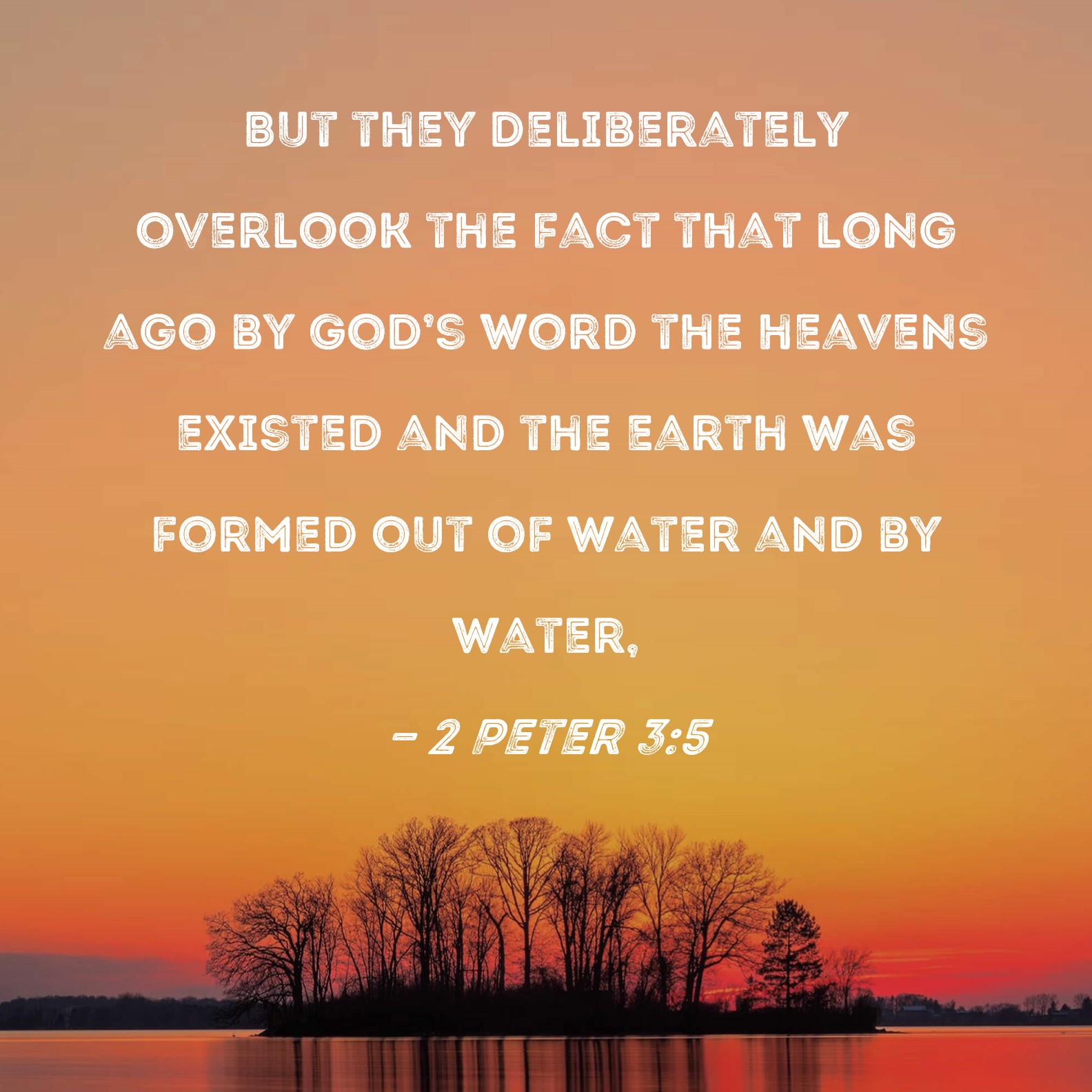 BSB: But they deliberately overlook the fact that long ago by God's word the heavens existed and the earth was formed out of water and by water, KJV: For this they willingly are ignorant of, that by the word of God the heavens were of old, and the earth standing out of the water and in the water: DRB: For this they are wilfully ignorant of, that the heavens were before, and the earth out of water, and through water, consisting by the word of God. DBT: For this is hidden from them through their own wilfulness, that heavens were of old, and an earth, having its subsistence out of water and in water, by the word of God, ERV: For this they wilfully forget, that there were heavens from of old, and an earth compacted out of water and amidst water, by the word of God; WBT: For this they willingly are ignorant of, that by the word of God the heavens were of old, and the earth standing out of the water and in the water: WEB: For they willfully forget that there were heavens from of old, and an earth formed out of water and amid water by the word of God, YLT: for this is unobserved by them willingly, that the heavens were of old, and the earth out of water and through water standing together by the word of God,Links 2 Peter 3:5 NIV • 2 Peter 3:5 NLT • 2 Peter 3:5 ESV • 2 Peter 3:5 NASB • 2 Peter 3:5 KJV • 2 Peter 3:5 Interlinear • 2 Peter 3:5 Commentaries • 2 Peter 3:5 Parallel Texts • 2 Peter 3:5 Bible Apps • 2 Peter 3:5 Parallel • Bible Hub |