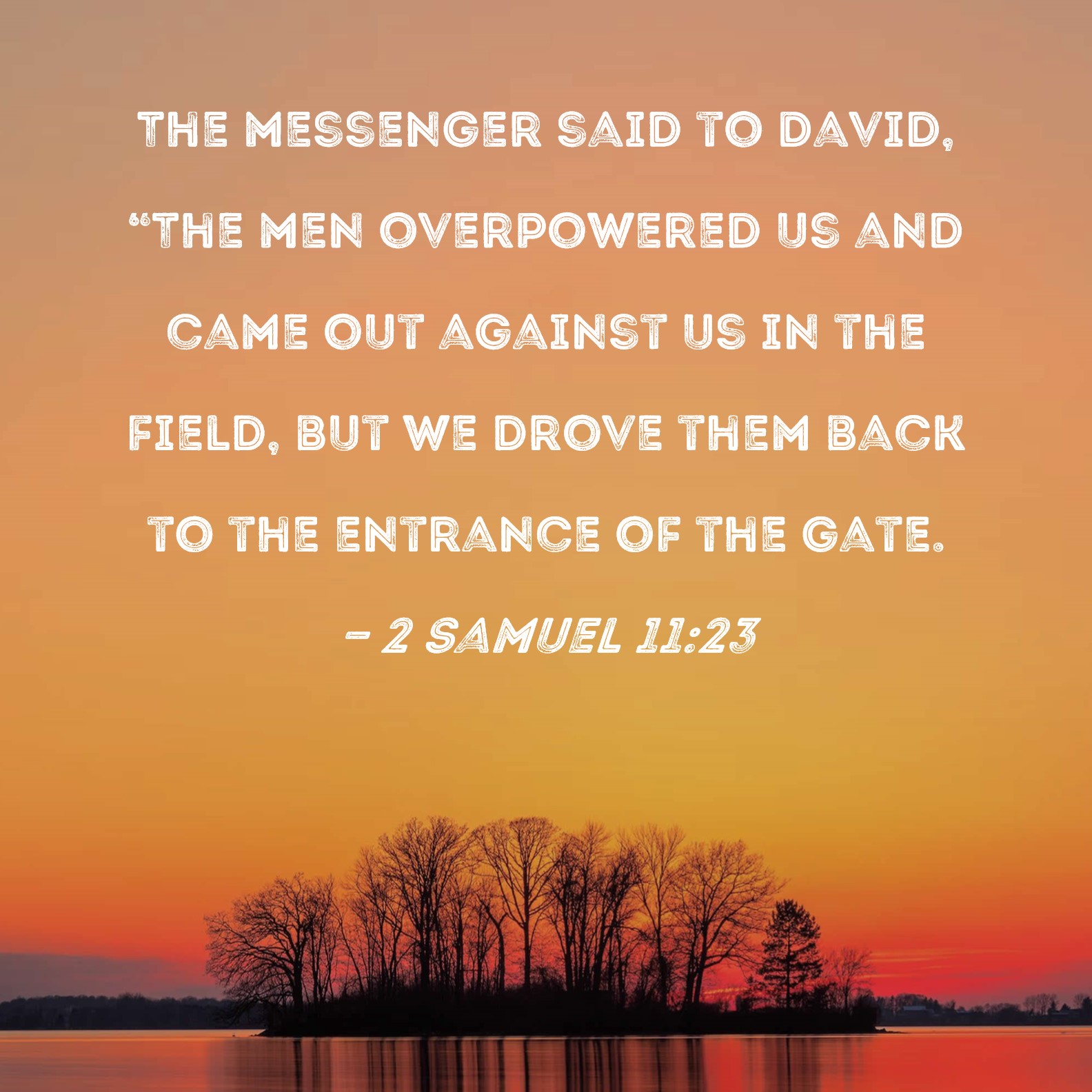 2 Samuel 11:23 The messenger said to David, "The men overpowered us and came out against us in the field, but we drove them back to the entrance of the gate.