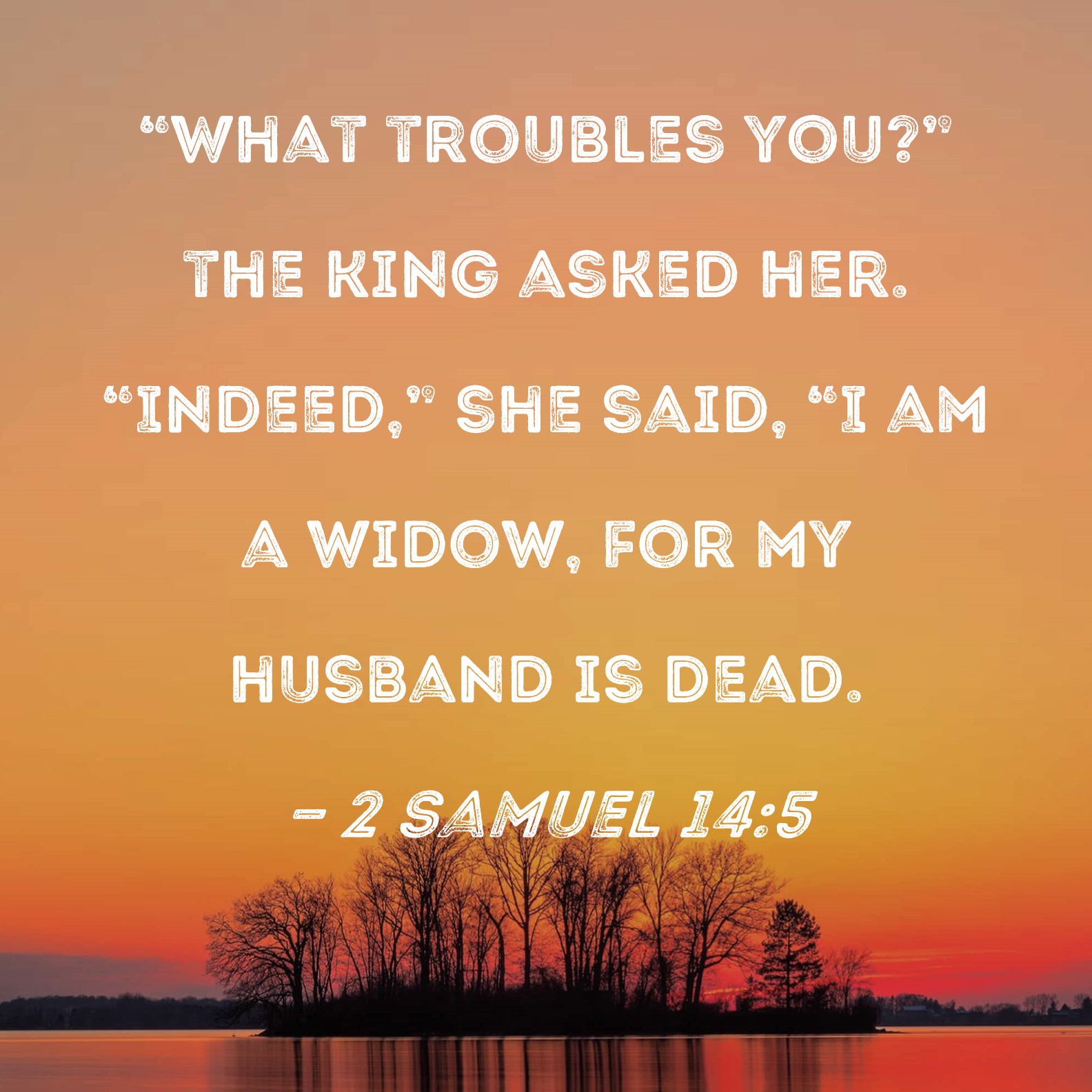 2 Samuel 14:5 "What troubles you?" the king asked her. "Indeed," she said, "I am a widow, for my husband is dead.