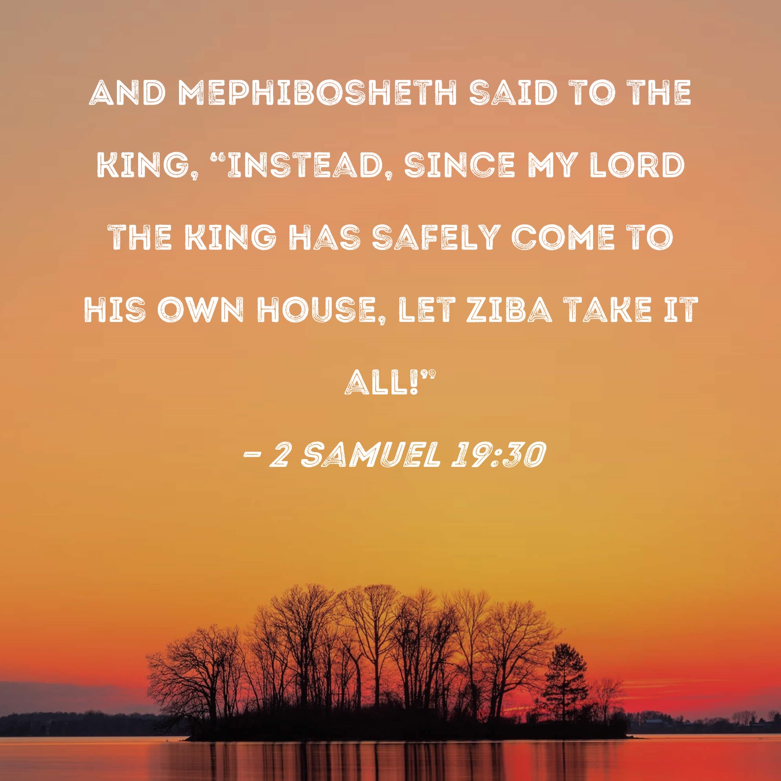 2 Samuel 19:30 And Mephibosheth said to the king, "Instead, since my lord the king has safely come to his own house, let Ziba take it all!"