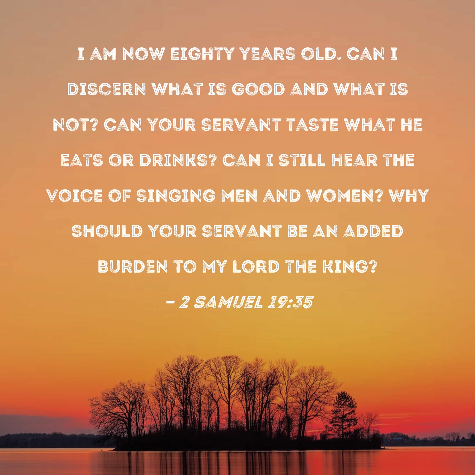 2 Samuel 19:35 I am now eighty years old. Can I discern what is good and what is not? Can your servant taste what he eats or drinks? Can I still hear the voice of singing men and women? Why should your servant be an added burden to my lord the king?