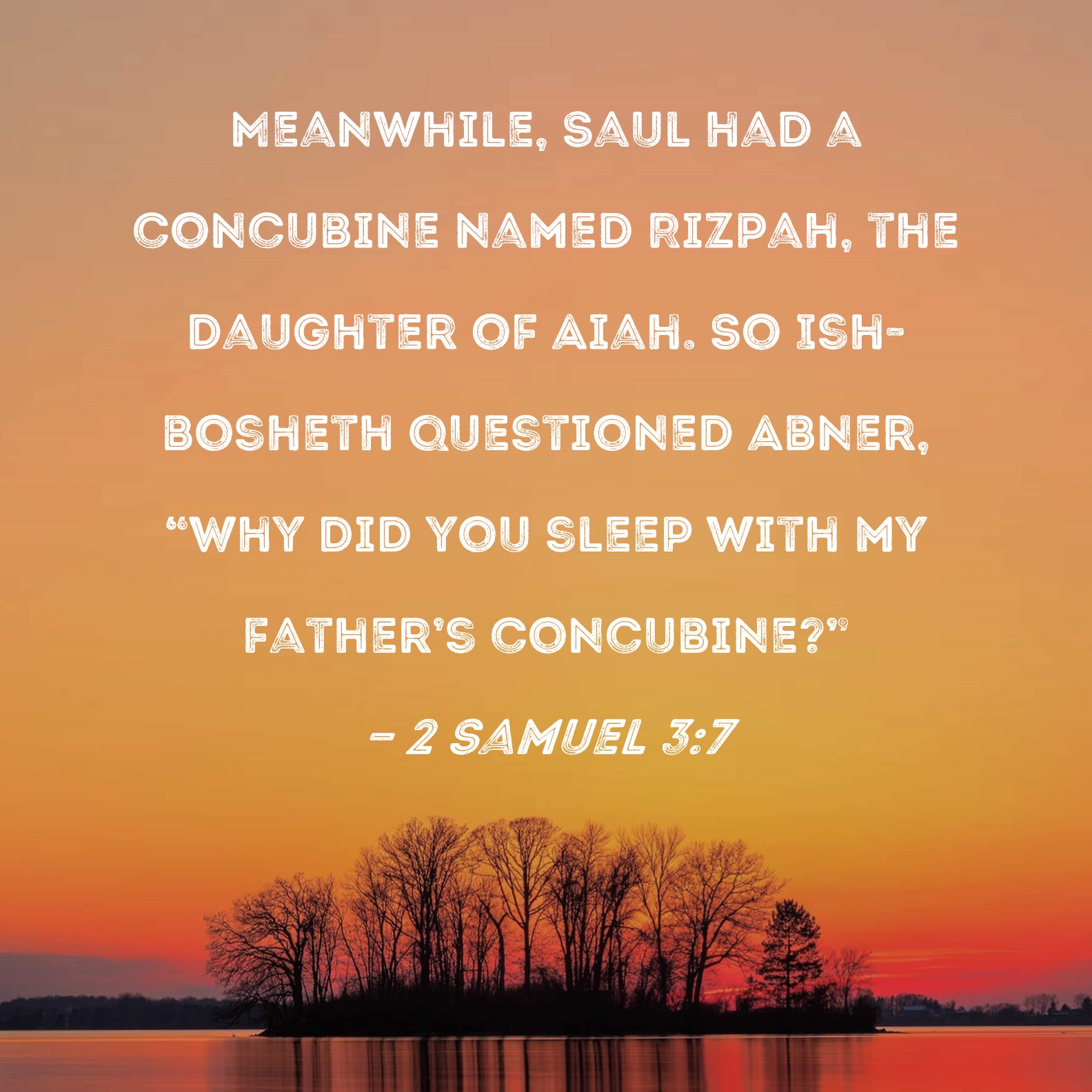 2 Samuel 3:7 Meanwhile, Saul had a concubine named Rizpah, the daughter of Aiah. So Ish-bosheth questioned Abner, "Why did you sleep with my father's concubine?"