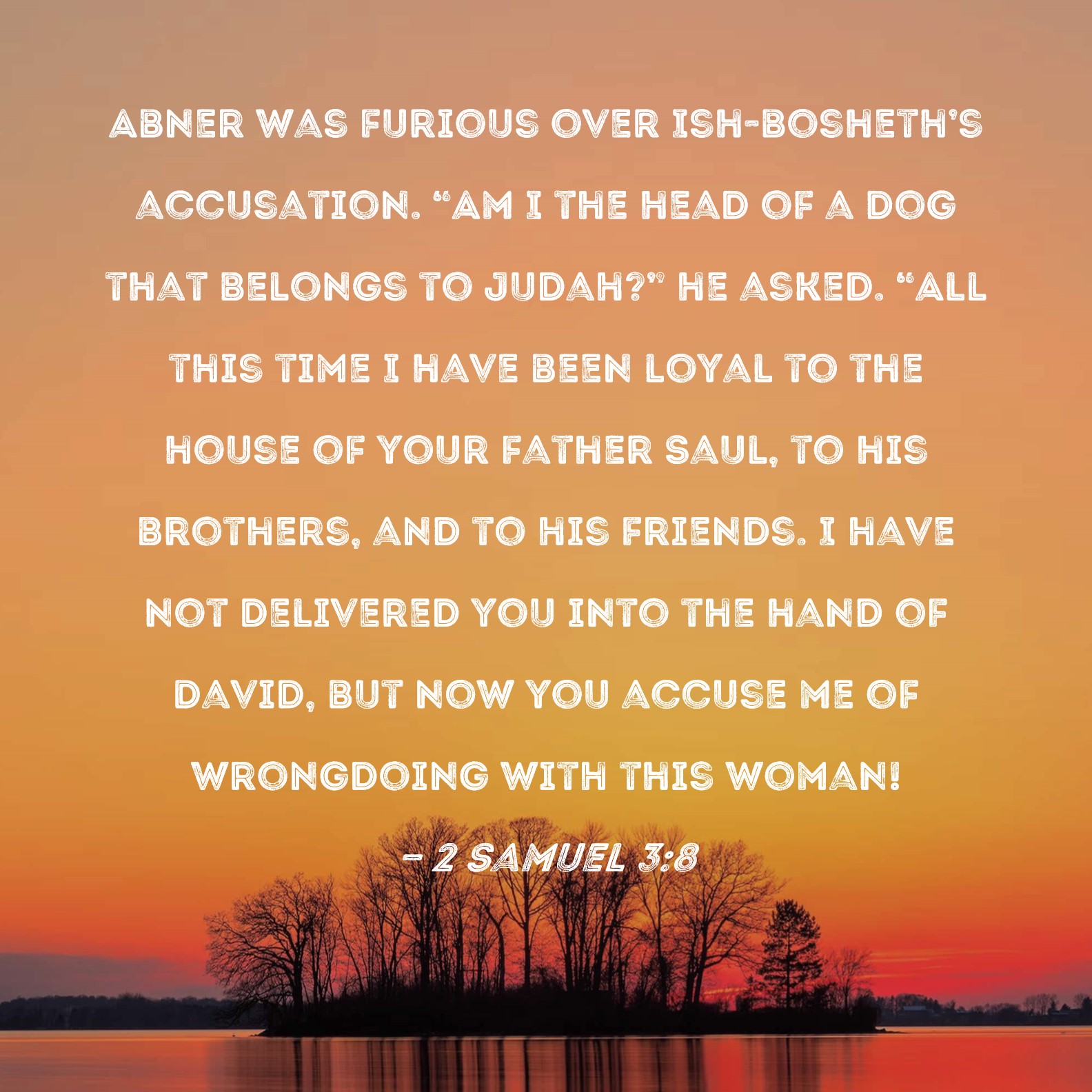 2 Samuel 3:8 Abner was furious over Ish-bosheth's accusation. "Am I the head of a dog that belongs to Judah?" he asked. "All this time I have been loyal to the house of your father Saul, to his brothers, and to his friends. I have not delivered you into the hand of David, but now you accuse me of wrongdoing with this woman!