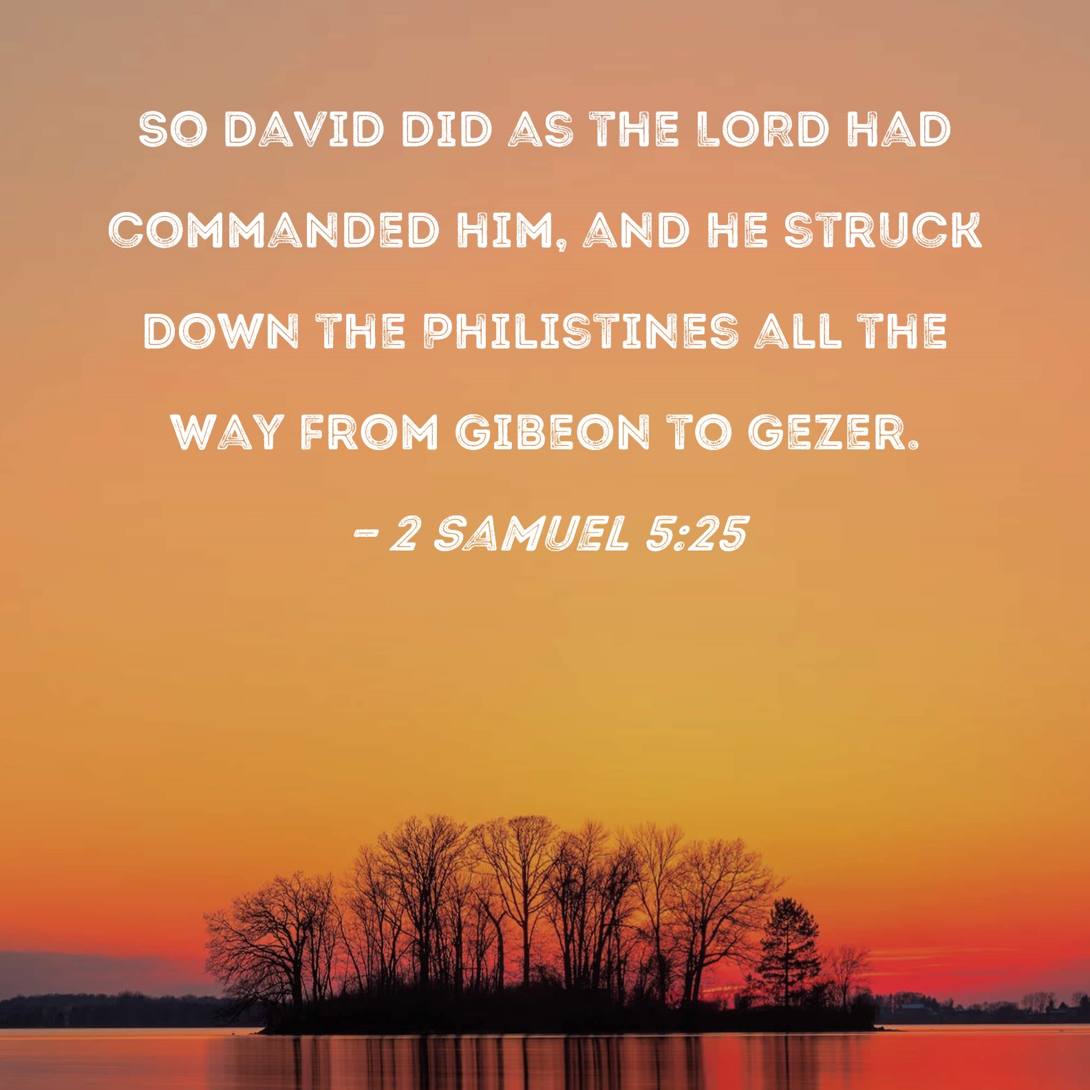 2 Samuel 5:25 So David did as the LORD had commanded him, and he struck down the Philistines all the way from Gibeon to Gezer.