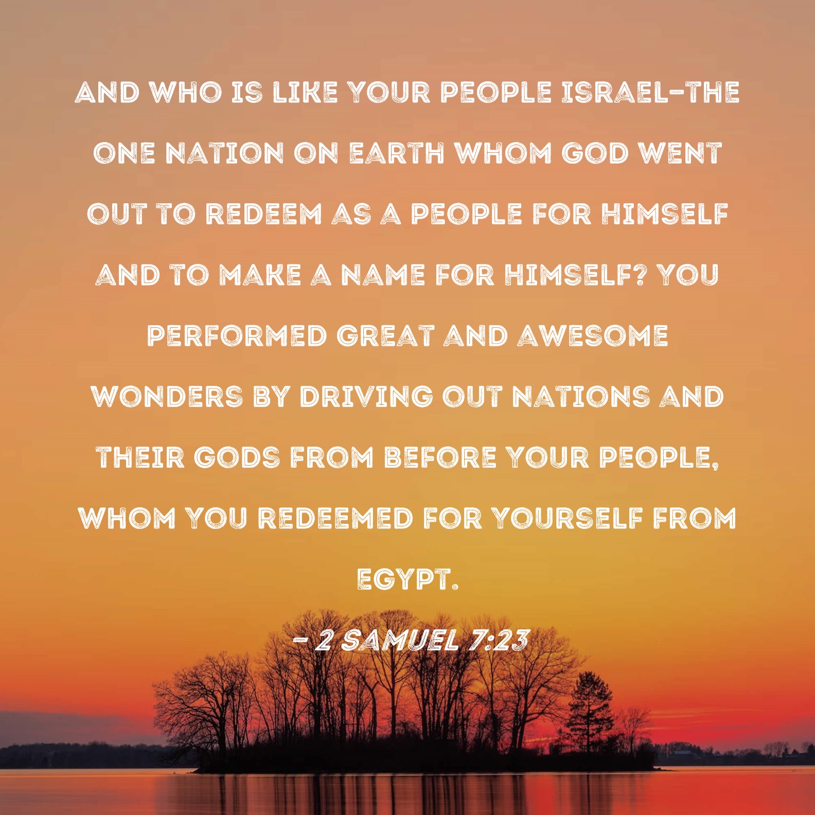2 Samuel 7:23 And who is like Your people Israel--the one nation on earth whom God went out to redeem as a people for Himself and to make a name for Himself? You performed great and awesome wonders by driving out nations and their gods from before Your people, whom You redeemed for Yourself from Egypt.