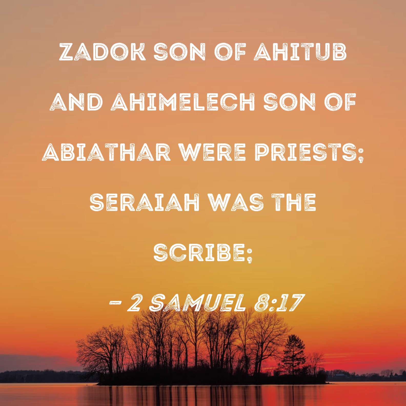 2 Samuel 8:17 Zadok son of Ahitub and Ahimelech son of Abiathar were priests; Seraiah was the scribe;