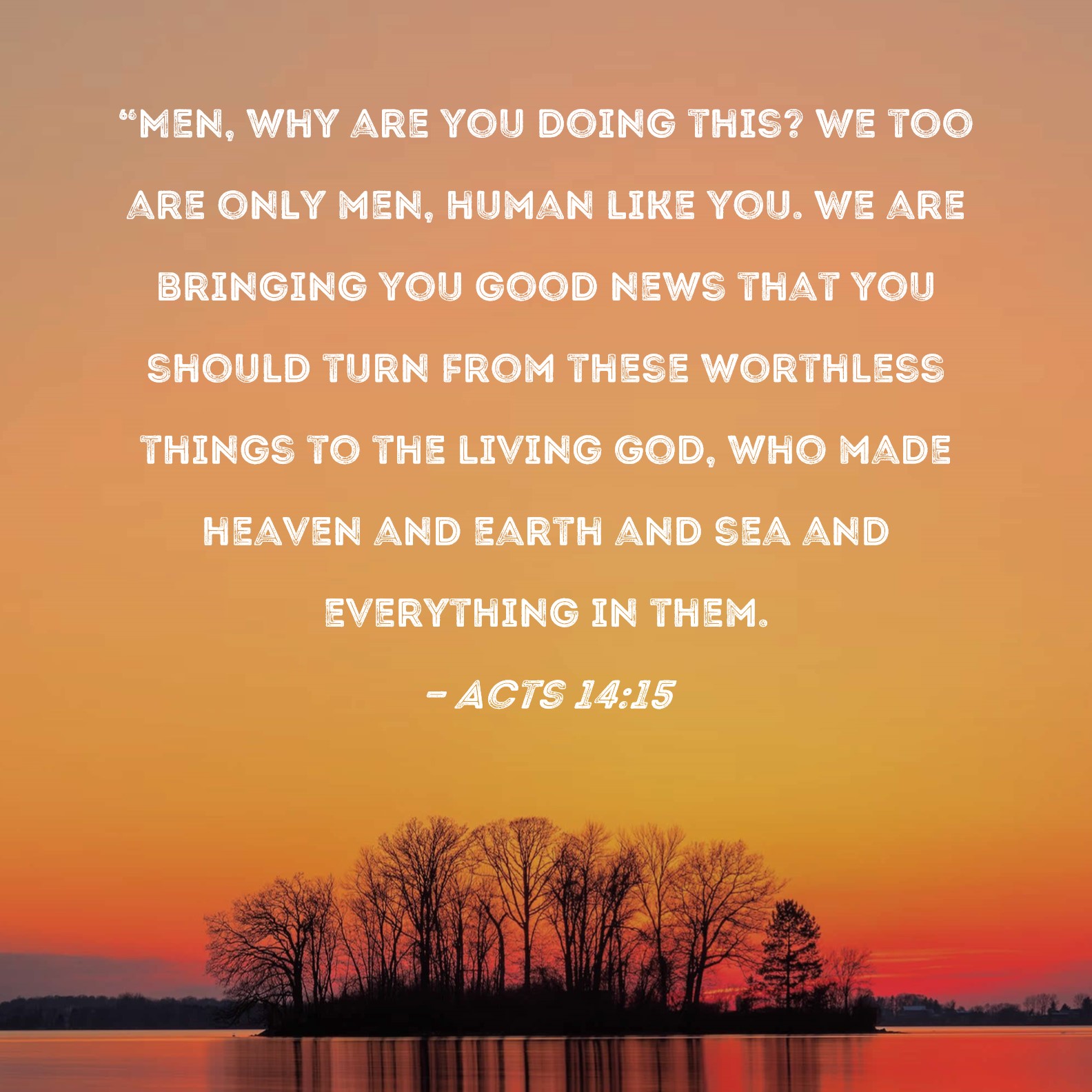 Acts 14:15 "Men, why are you doing this? We too are only men, human like you. We are bringing you good news that you should turn from these worthless things to the living God, who made heaven and earth and sea and everything in them.