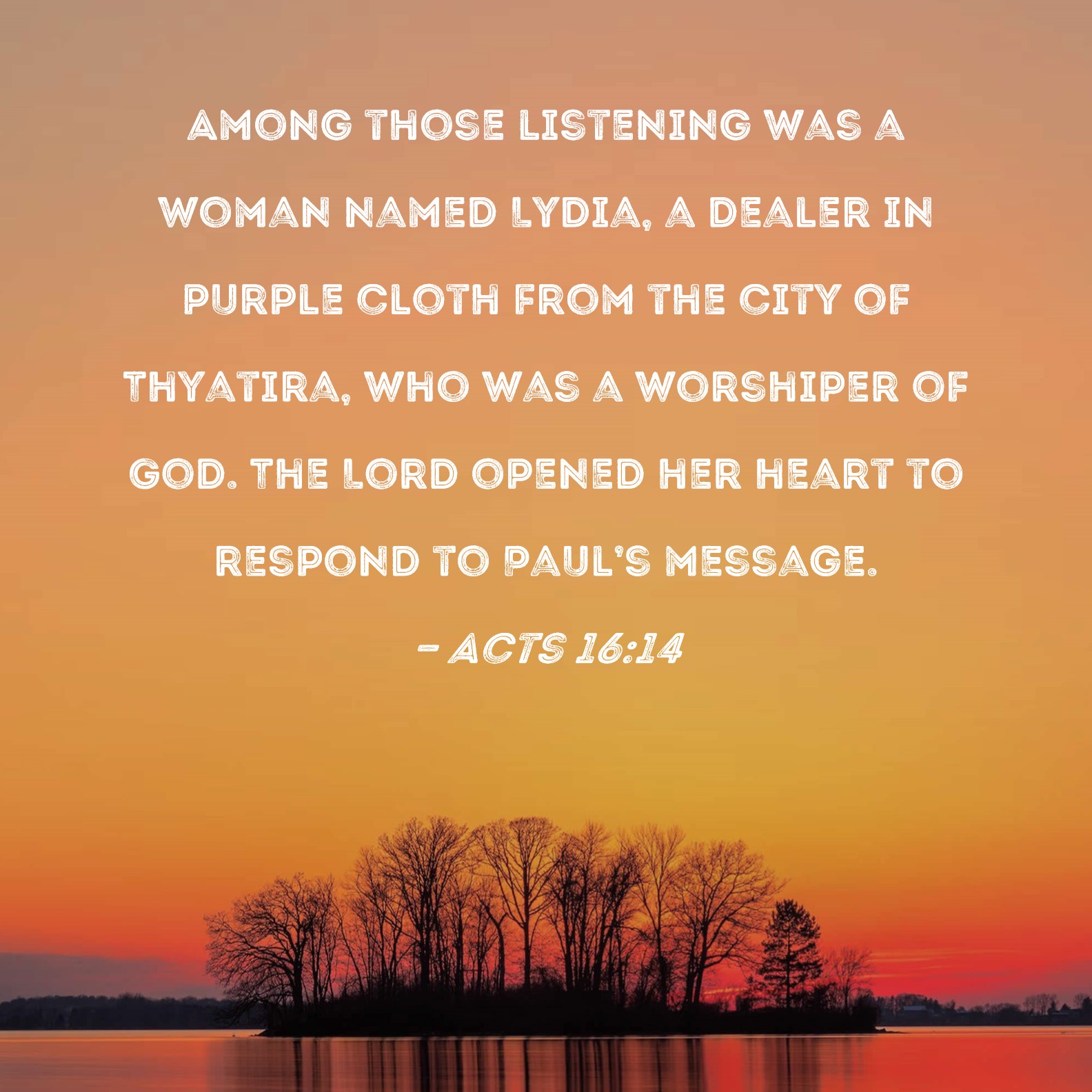 Acts 16:14 Among those listening was a woman named Lydia, a dealer in purple cloth from the city of Thyatira, who was a worshiper of God. The Lord opened her heart to respond to Paul's message.