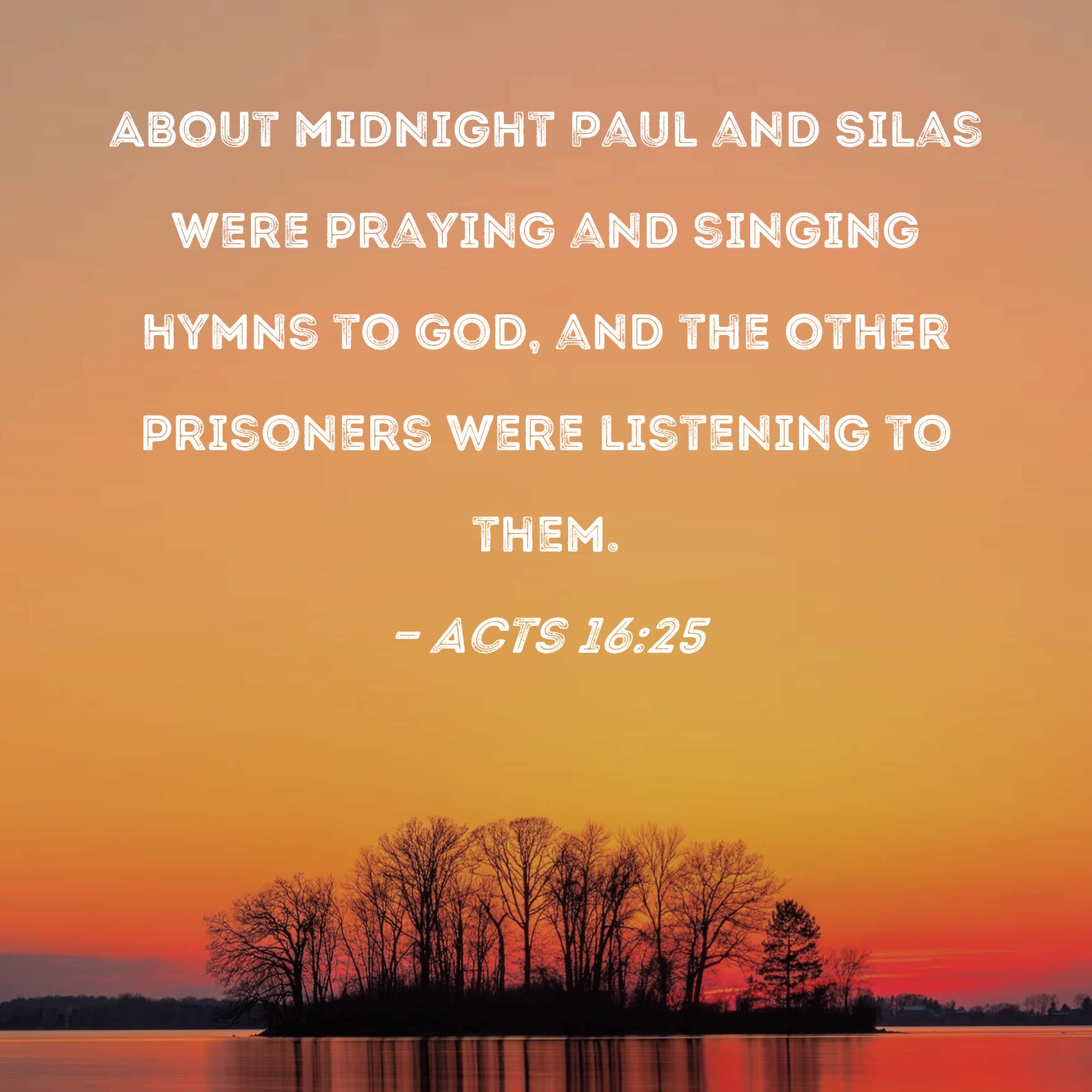 Acts 16:25 About midnight Paul and Silas were praying and singing hymns to God, and the other prisoners were listening to them.