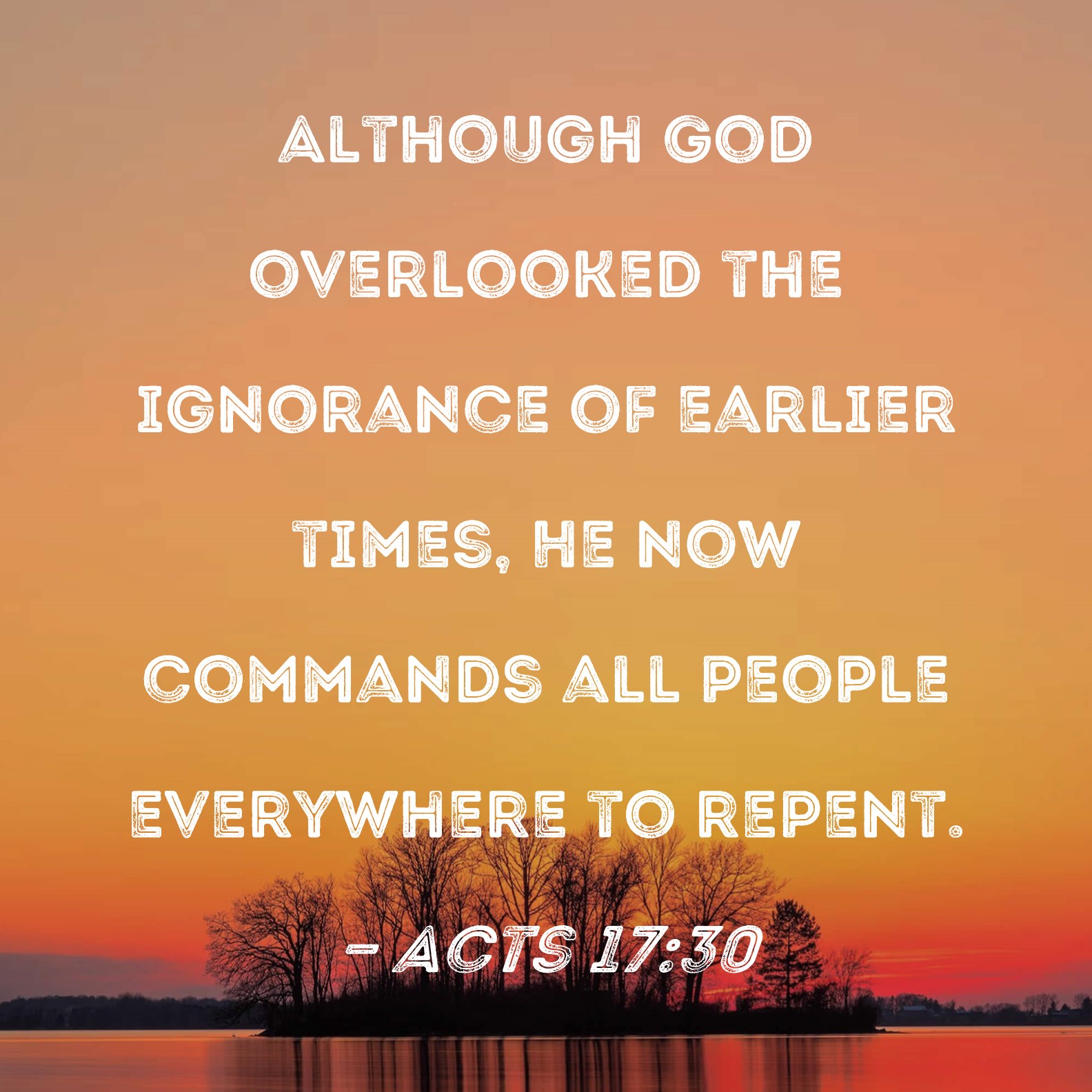 Acts 17:30 Although God overlooked the ignorance of earlier times, He now commands all people everywhere to repent.