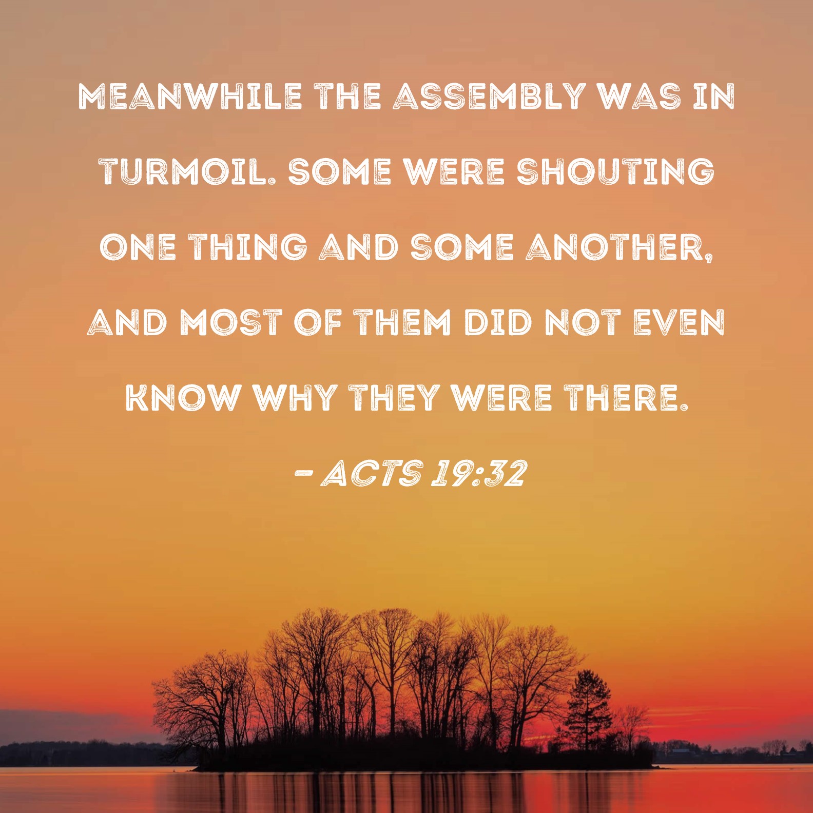 Acts 19:32 Meanwhile the assembly was in turmoil. Some were shouting one thing and some another, and most of them did not even know why they were there.