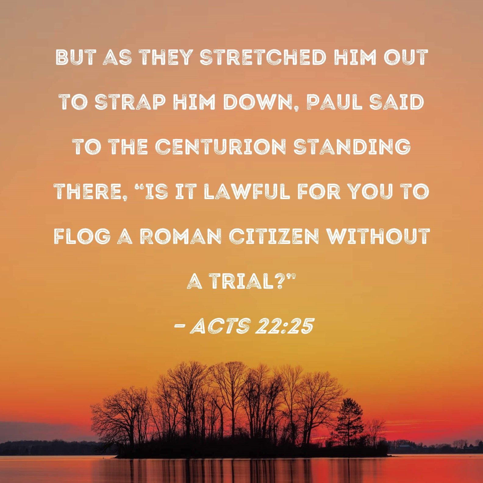 Acts 22:25 But as they stretched him out to strap him down, Paul said to the centurion standing there, "Is it lawful for you to flog a Roman citizen without a trial?"