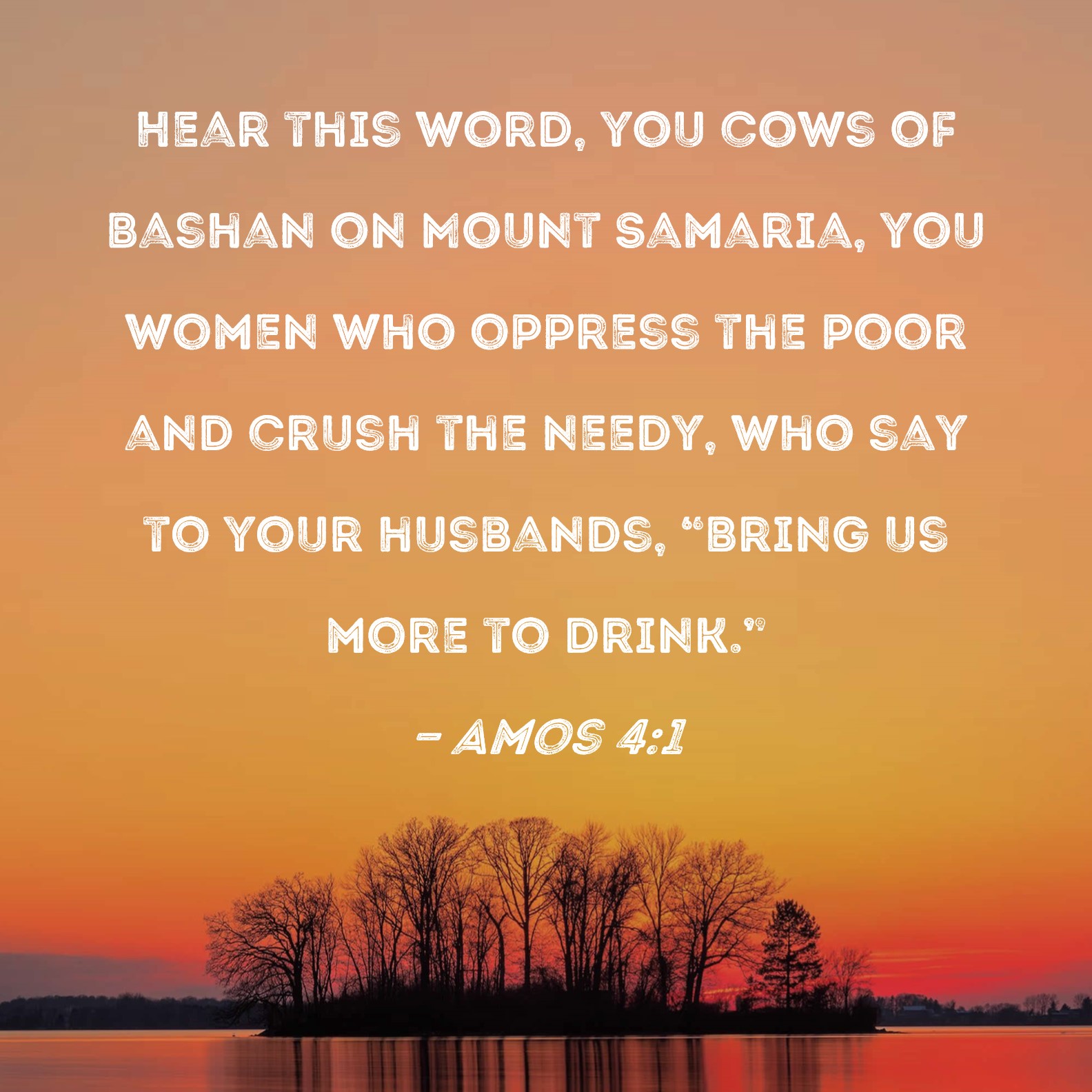 Amos 4:1 Hear this word, you cows of Bashan on Mount Samaria, you women who oppress the poor and crush the needy, who say to your husbands, "Bring us more to drink."