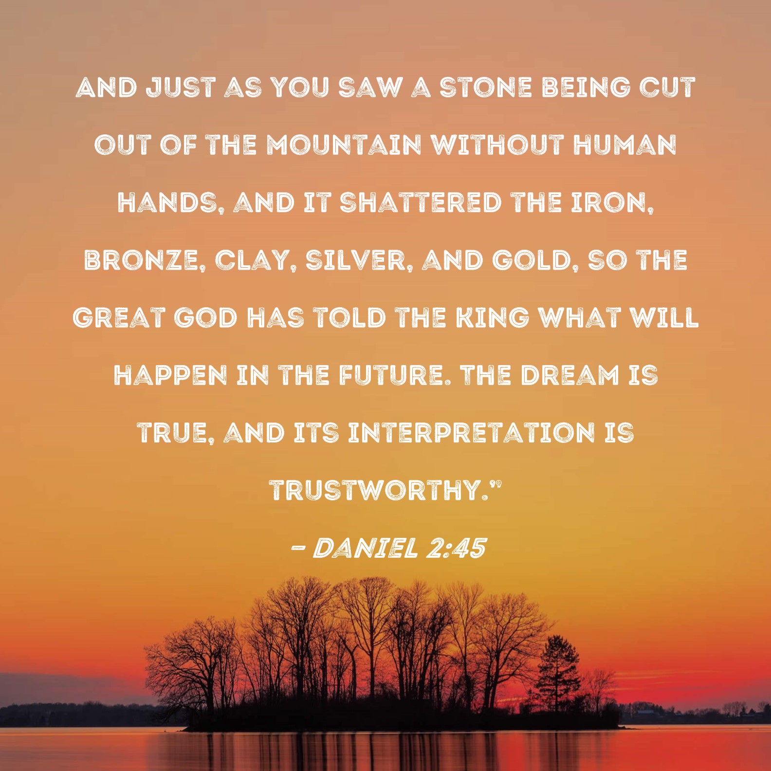 Daniel 2:45 And just as you saw a stone being cut out of the mountain without human hands, and it shattered the iron, bronze, clay, silver, and gold, so the great God has told the king what will happen in the future. The dream is true, and its interpretation is trustworthy."