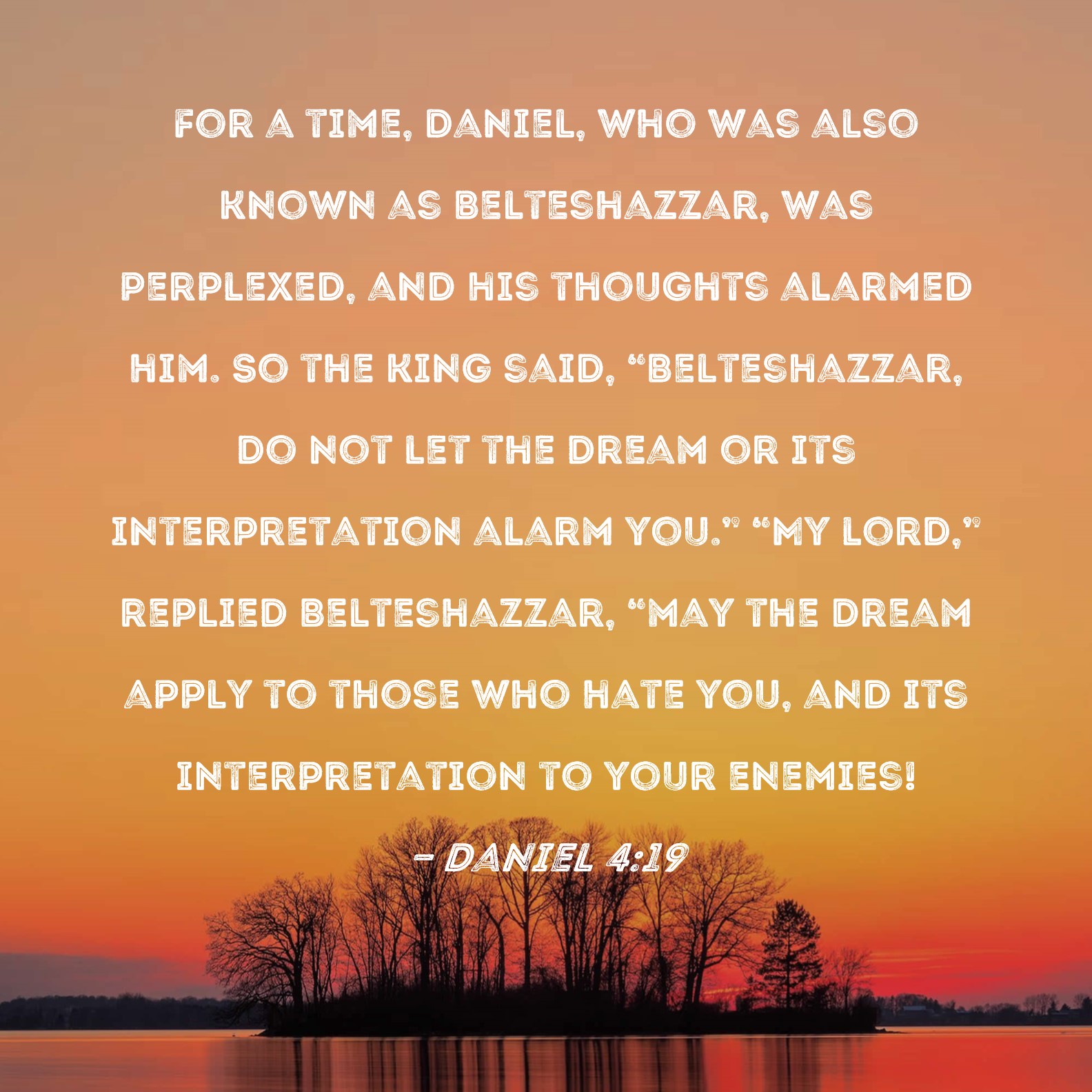 Daniel 4:19 For a time, Daniel, who was also known as Belteshazzar, was perplexed, and his thoughts alarmed him. So the king said, "Belteshazzar, do not let the dream or its interpretation alarm you." "My lord," replied Belteshazzar, "may the dream apply to those who hate you, and its interpretation to your enemies!