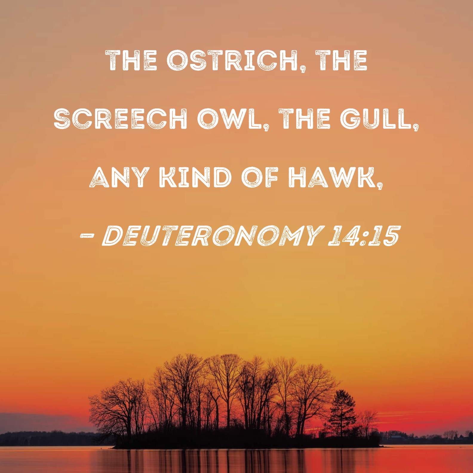 BSB: the ostrich, the screech owl, the gull, any kind of hawk, KJV: And the owl, and the night hawk, and the cuckow, and the hawk after his kind, DRB: And the ostrich, and the owl, and the larus, and the hawk according to its kind: DBT: and the female ostrich, and the male ostrich, and the sea-gull, and the hawk after its kind; ERV: and the ostrich, and the night hawk, and the seamew, and the hawk after its kind; WBT: And the owl, and the night-hawk, and the cuckow, and the hawk after his kind, WEB: the ostrich, the owl, the seagull, the hawk of any kind, YLT: and the owl, and the night-hawk, and the cuckoo, and the hawk after its kind;Links Deuteronomy 14:15 NIV • Deuteronomy 14:15 NLT • Deuteronomy 14:15 ESV • Deuteronomy 14:15 NASB • Deuteronomy 14:15 KJV • Deuteronomy 14:15 Interlinear • Deuteronomy 14:15 Commentaries • Deuteronomy 14:15 Parallel Texts • Deuteronomy 14:15 Bible Apps • Deuteronomy 14:15 Parallel • Bible Hub |