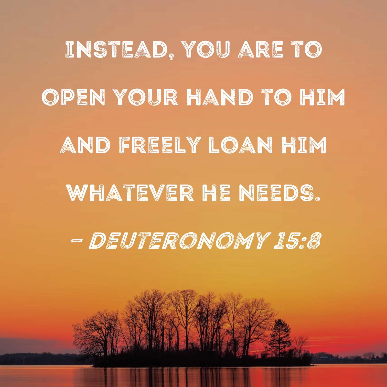 Deuteronomy 15:8 Instead, you are to open your hand to him and freely loan him whatever he needs.