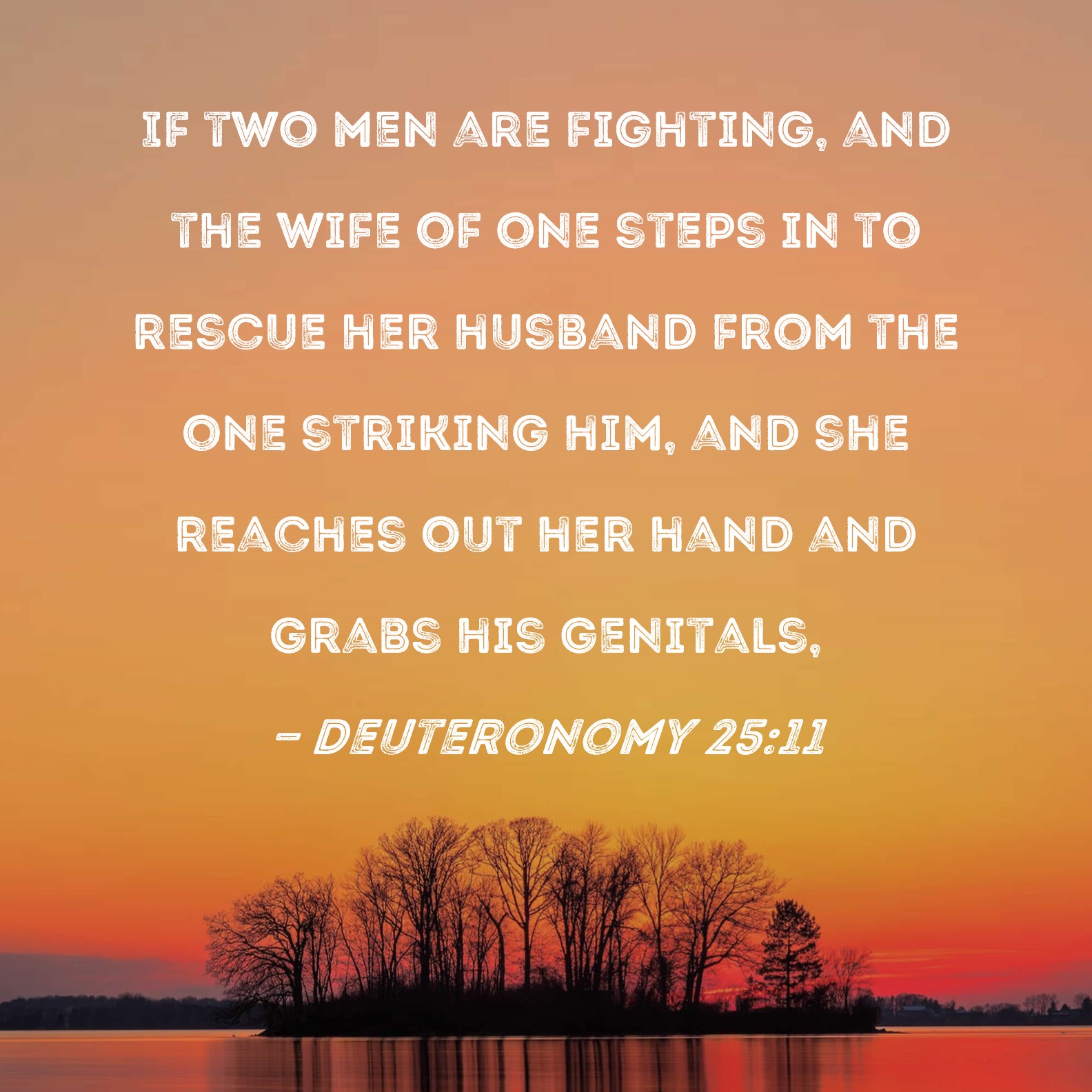 Deuteronomy 25:11 If two men are fighting, and the wife of one steps in to rescue her husband from the one striking him, and she reaches out her hand and grabs his genitals,