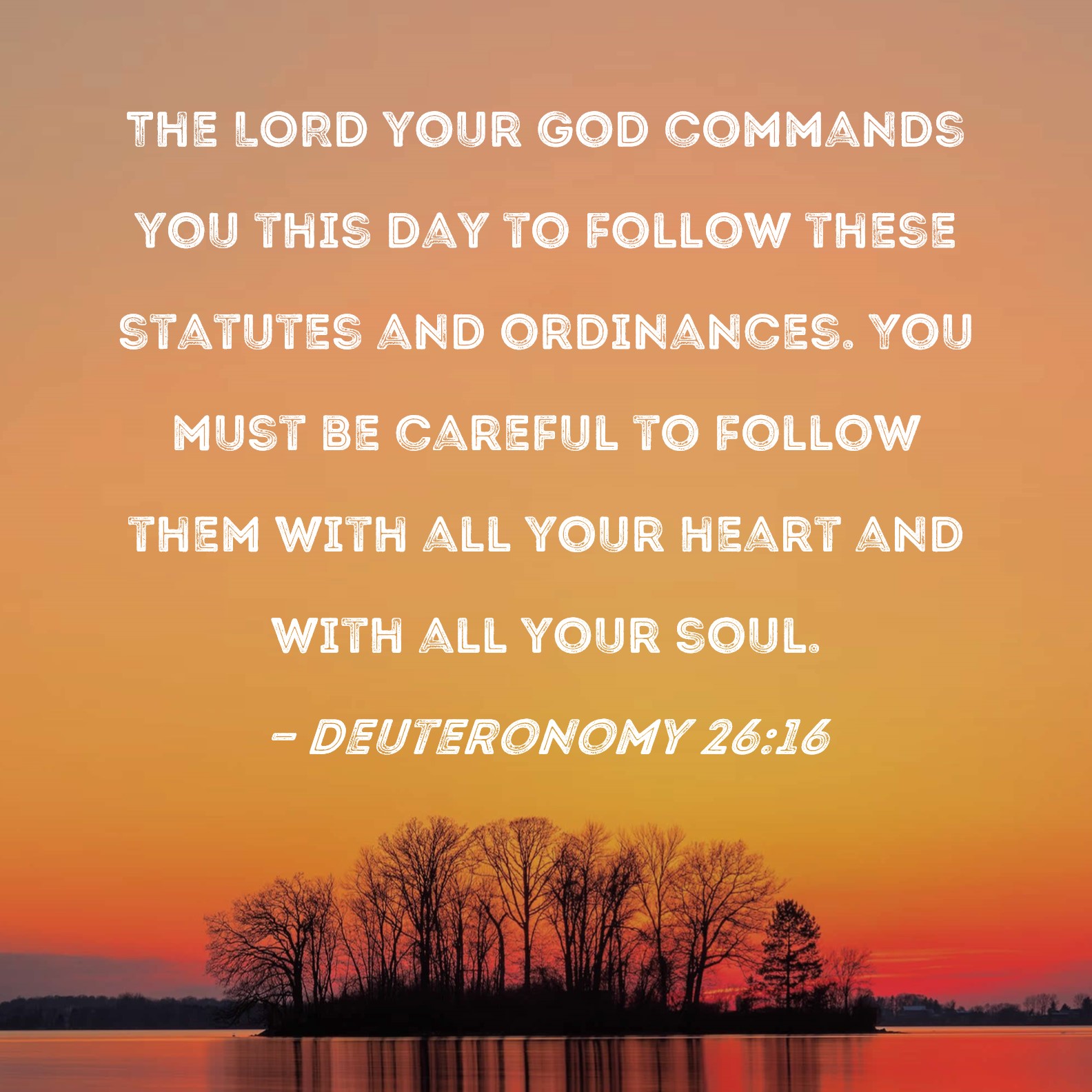 Deuteronomy 26:16 The LORD your God commands you this day to follow these statutes and ordinances. You must be careful to follow them with all your heart and with all your soul.
