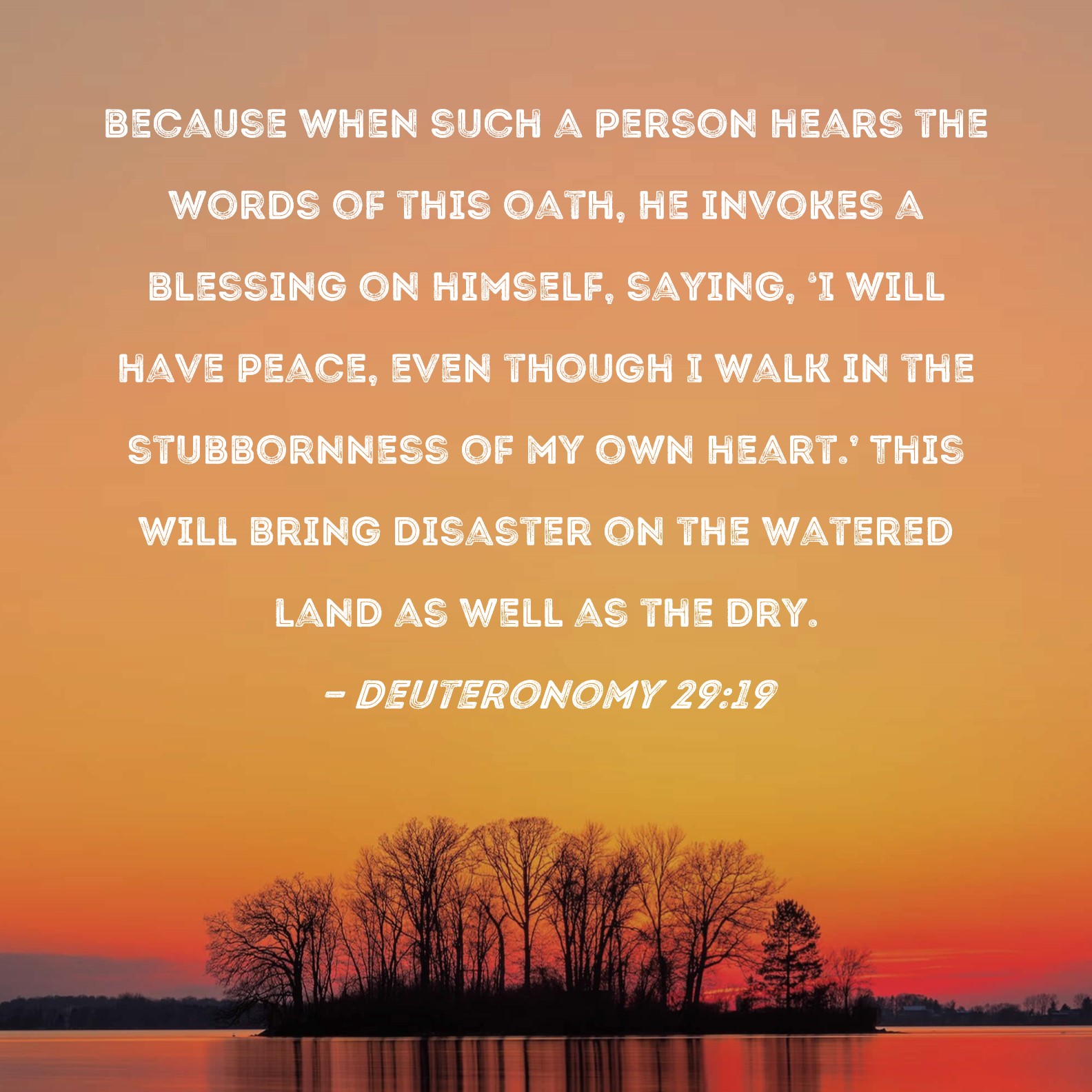 Deuteronomy 29:19 because when such a person hears the words of this oath, he invokes a blessing on himself, saying, 'I will have peace, even though I walk in the stubbornness of my own heart.' This will bring disaster on the watered land as well as the dry.