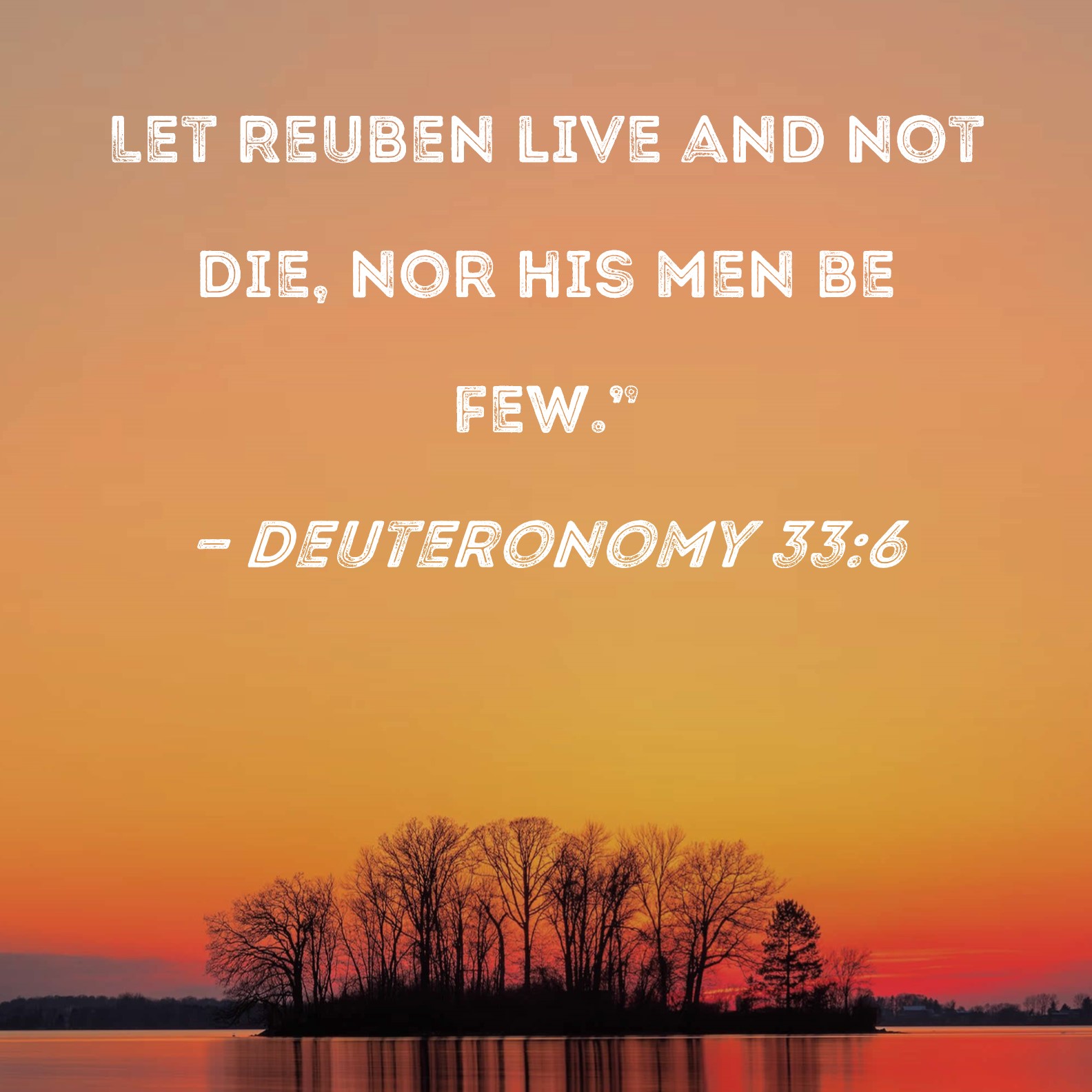 BSB: Let Reuben live and not die, nor his men be few." KJV: Let Reuben live, and not die; and let not his men be few. DRB: Let Ruben live, and not die, and be he small in number. DBT: Let Reuben live, and not die; And let his men be few. ERV: Let Reuben live, and not die; Yet let his men be few. WBT: Let Reuben live, and not die; and let not his men be few. WEB: “Let Reuben live, and not die; Nor let his men be few.” YLT: Let Reuben live, and not die, And let his men be a number.Links Deuteronomy 33:6 NIV • Deuteronomy 33:6 NLT • Deuteronomy 33:6 ESV • Deuteronomy 33:6 NASB • Deuteronomy 33:6 KJV • Deuteronomy 33:6 Interlinear • Deuteronomy 33:6 Commentaries • Deuteronomy 33:6 Parallel Texts • Deuteronomy 33:6 Bible Apps • Deuteronomy 33:6 Parallel • Bible Hub |