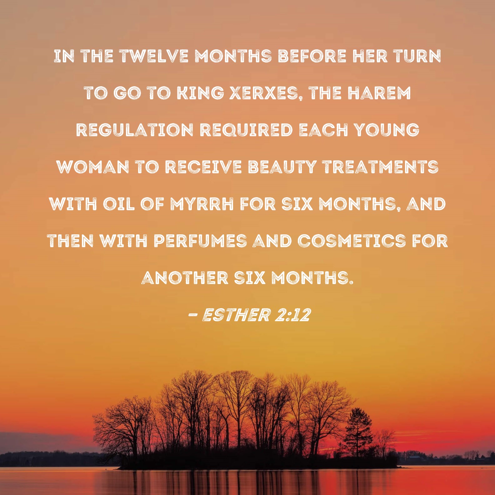Esther 2:12 In the twelve months before her turn to go to King Xerxes, the harem regulation required each young woman to receive beauty treatments with oil of myrrh for six months, and then with perfumes and cosmetics for another six months.