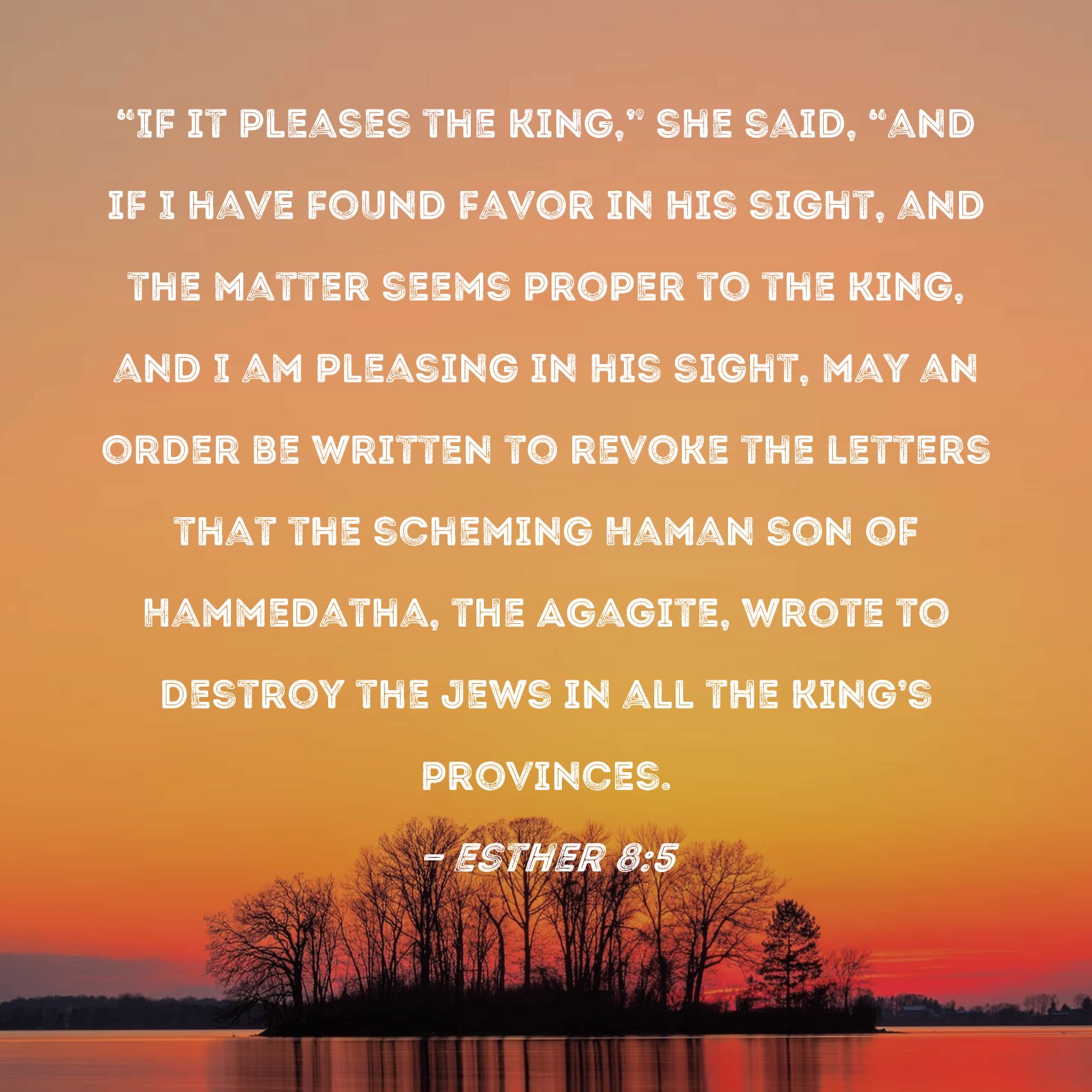 Esther 8:5 "If it pleases the king," she said, "and if I have found favor in his sight, and the matter seems proper to the king, and I am pleasing in his sight, may an order be written to revoke the letters that the scheming Haman son of Hammedatha, the Agagite, wrote to destroy the Jews in all the king's provinces.