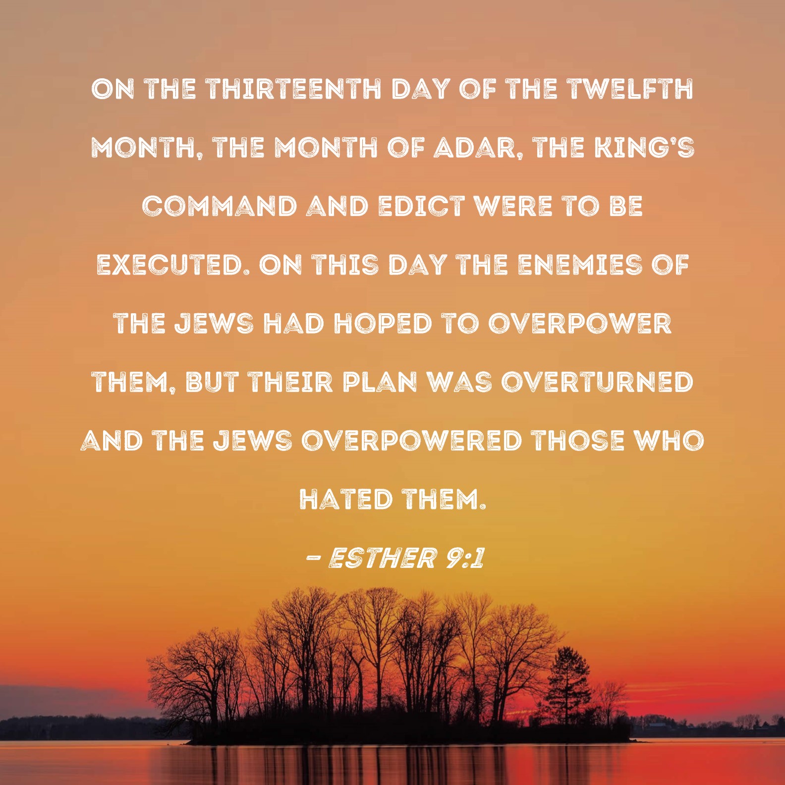 Esther 9:1 On the thirteenth day of the twelfth month, the month of Adar, the king's command and edict were to be executed. On this day the enemies of the Jews had hoped to overpower them, but their plan was overturned and the Jews overpowered those who hated them.