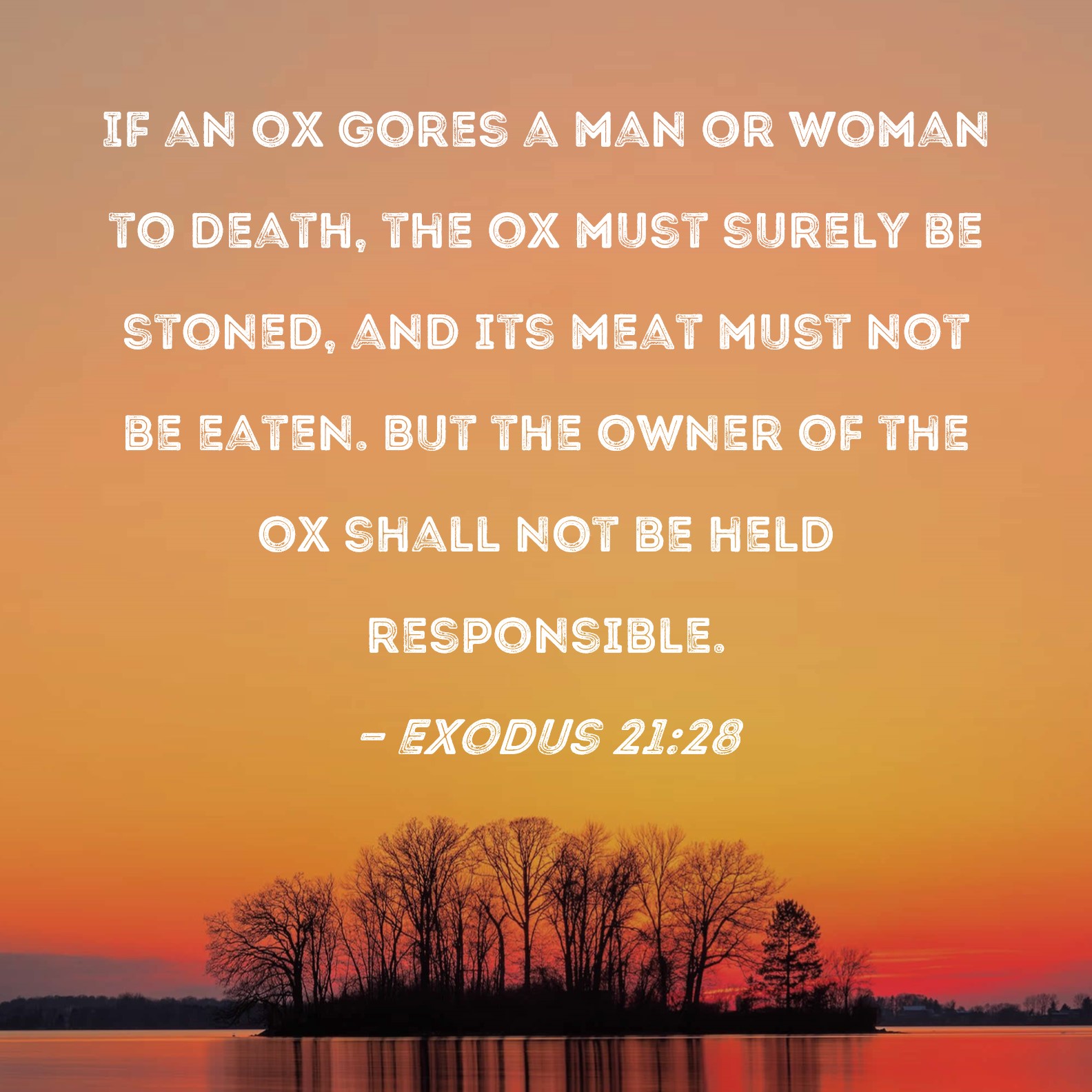 DBT:  And if an ox gore a man or a woman, so that they die, then the ox shall certainly be stoned, and its flesh shall not be eaten; but the owner of the ox shall be guiltless.