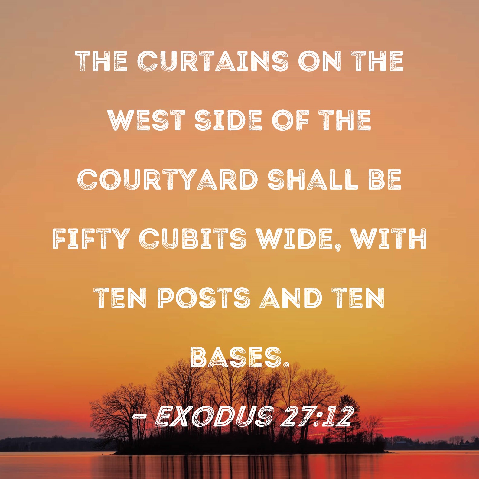 Exodus 27:12 The curtains on the west side of the courtyard shall be fifty cubits wide, with ten posts and ten bases.
