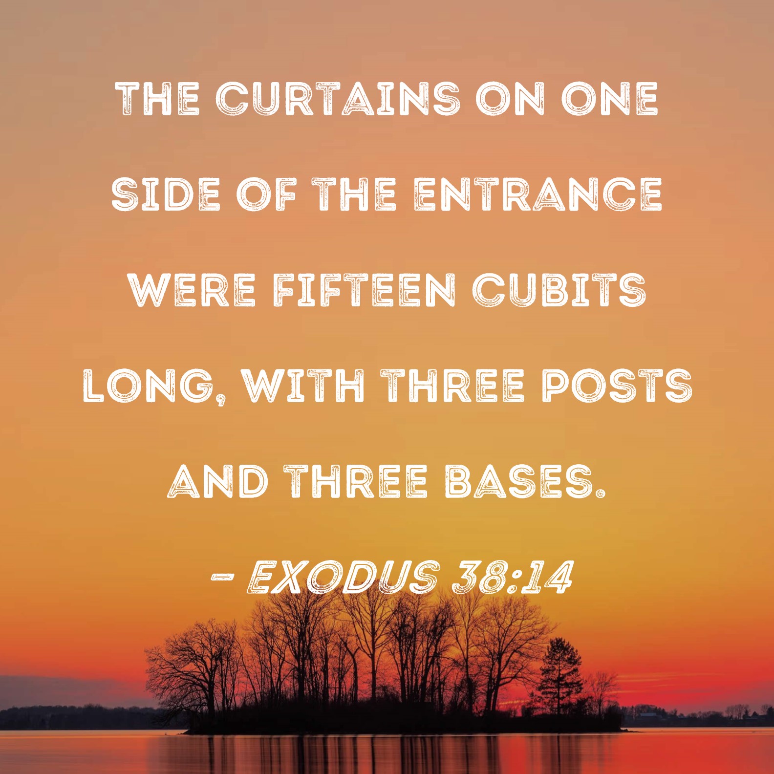 BSB: The curtains on one side of the entrance were fifteen cubits long, with three posts and three bases. KJV: The hangings of the one side of the gate were fifteen cubits; their pillars three, and their sockets three. DRB: Fifteen cubits of which were on one side with three pillars, and their sockets: DBT: the hangings on the one wing of fifteen cubits, their pillars three, and their bases three; ERV: The hangings for the one side of the gate were fifteen cubits; their pillars three, and their sockets three; WBT: The hangings of the one side of the gate were fifteen cubits; their pillars three, and their sockets three. WEB: the hangings for the one side were fifteen cubits; their pillars three, and their sockets three; YLT: The hangings on the side are fifteen cubits, their pillars three, and their sockets three,Links Exodus 38:14 NIV • Exodus 38:14 NLT • Exodus 38:14 ESV • Exodus 38:14 NASB • Exodus 38:14 KJV • Exodus 38:14 Interlinear • Exodus 38:14 Commentaries • Exodus 38:14 Parallel Texts • Exodus 38:14 Bible Apps • Exodus 38:14 Parallel • Bible Hub |