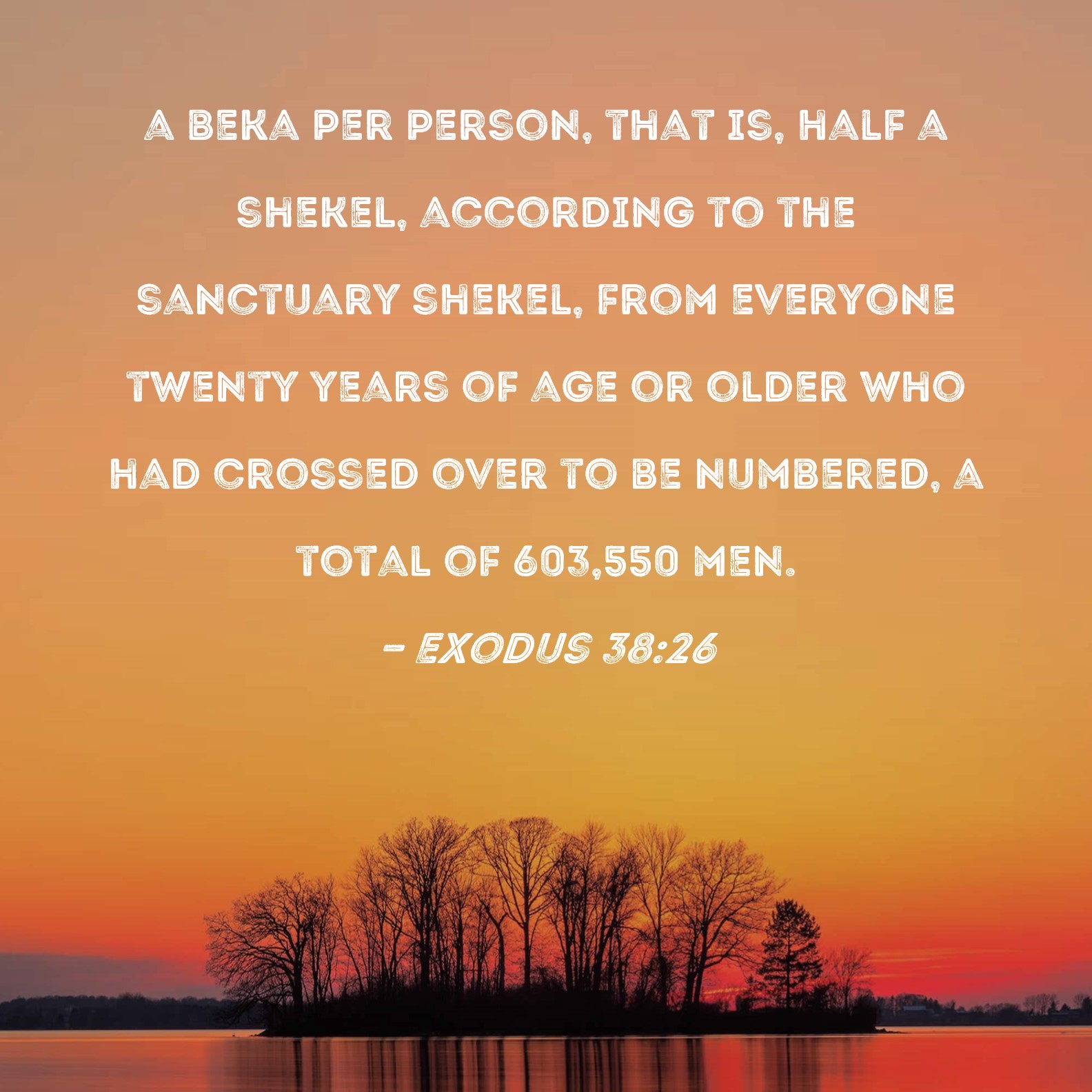 Exodus 38:26 a beka per person, that is, half a shekel, according to the sanctuary shekel, from everyone twenty years of age or older who had crossed over to be numbered, a total of 603,550 men.