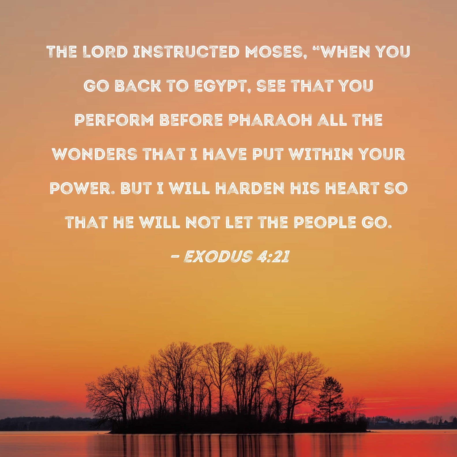 Exodus 4:21 The LORD instructed Moses, "When you go back to Egypt, see that you perform before Pharaoh all the wonders that I have put within your power. But I will harden his heart so that he will not let the people go.