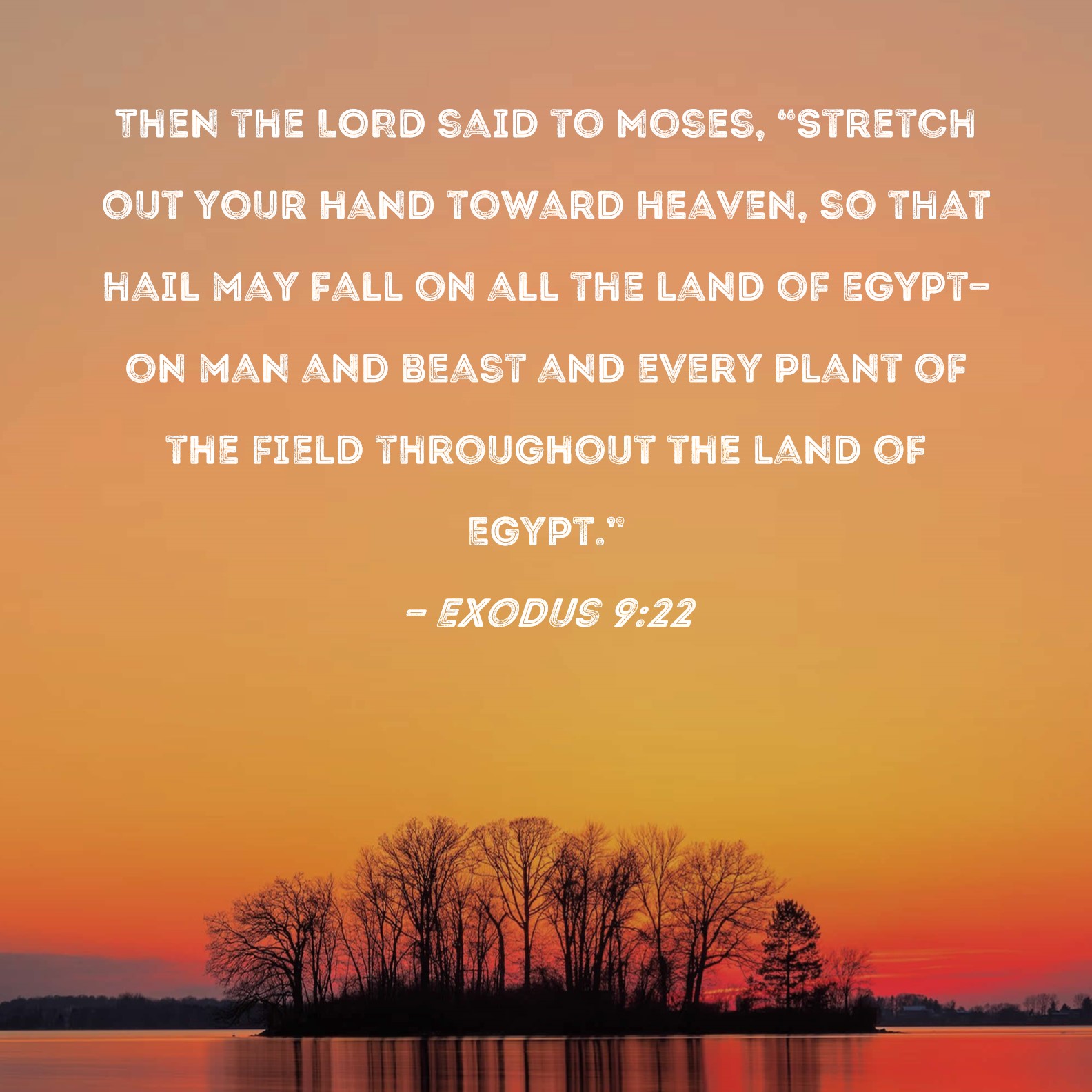 Exodus 9:22 Then the LORD said to Moses, "Stretch out your hand toward heaven, so that hail may fall on all the land of Egypt--on man and beast and every plant of the field throughout the land of Egypt."