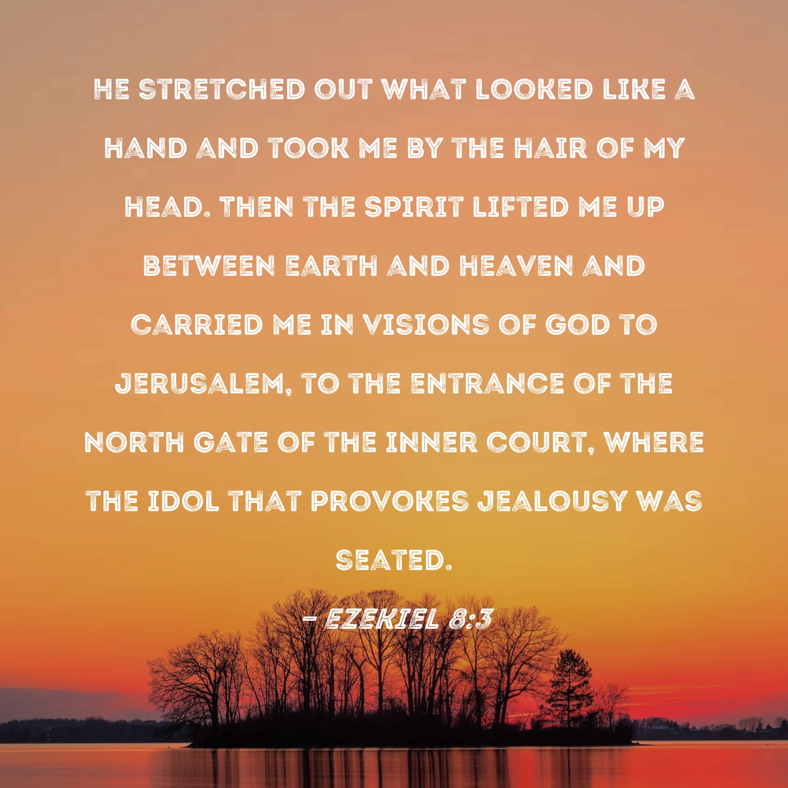 Ezekiel 8:3 He stretched out what looked like a hand and took me by the hair of my head. Then the Spirit lifted me up between earth and heaven and carried me in visions of God to Jerusalem, to the entrance of the north gate of the inner court, where the idol that provokes jealousy was seated.