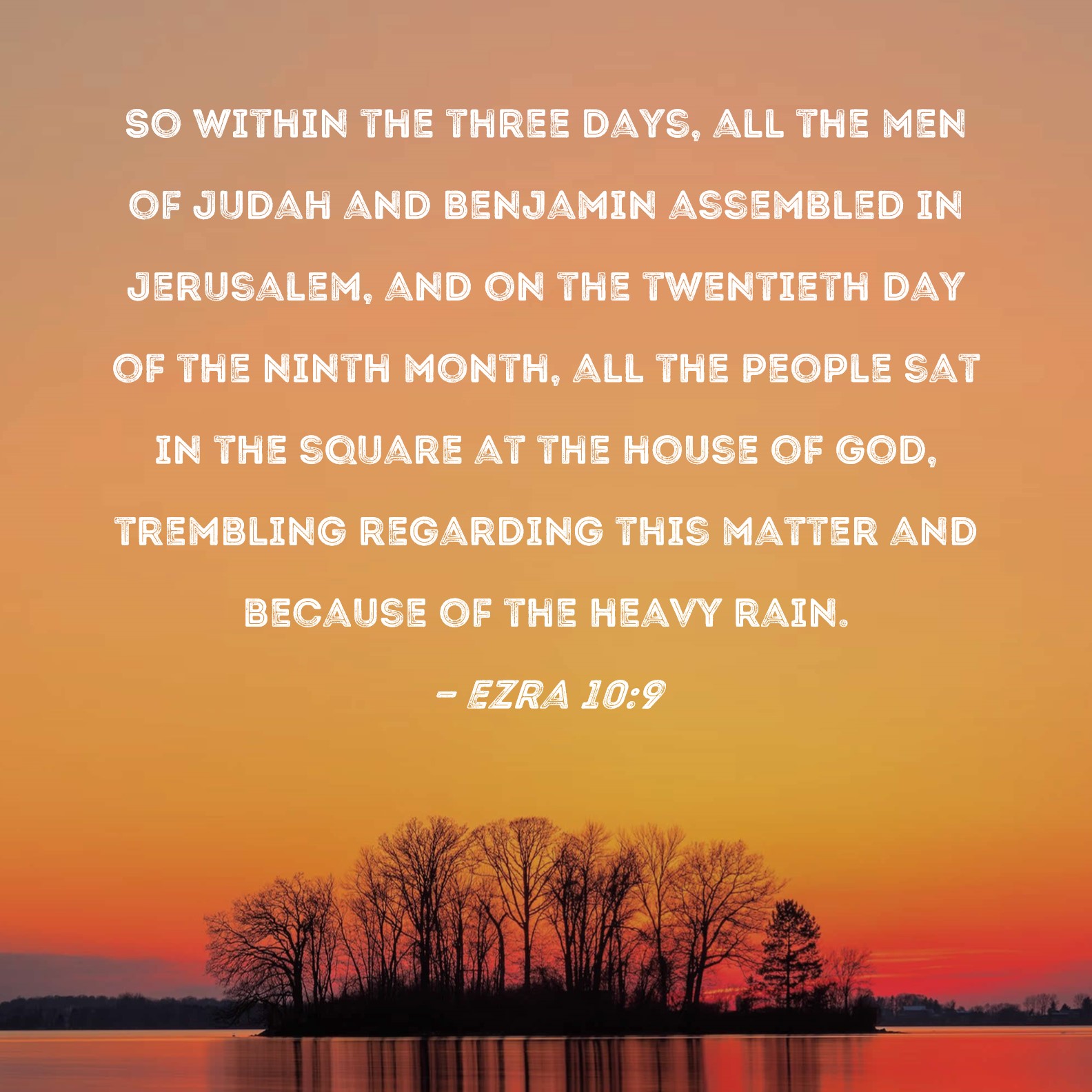 Ezra 10:9 So within the three days, all the men of Judah and Benjamin assembled in Jerusalem, and on the twentieth day of the ninth month, all the people sat in the square at the house of God, trembling regarding this matter and because of the heavy rain.