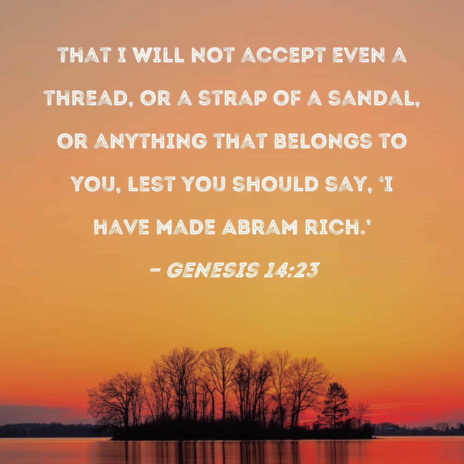 Genesis 14:23 that I will not accept even a thread, or a strap of a sandal, or anything that belongs to you, lest you should say, 'I have made Abram rich.'
