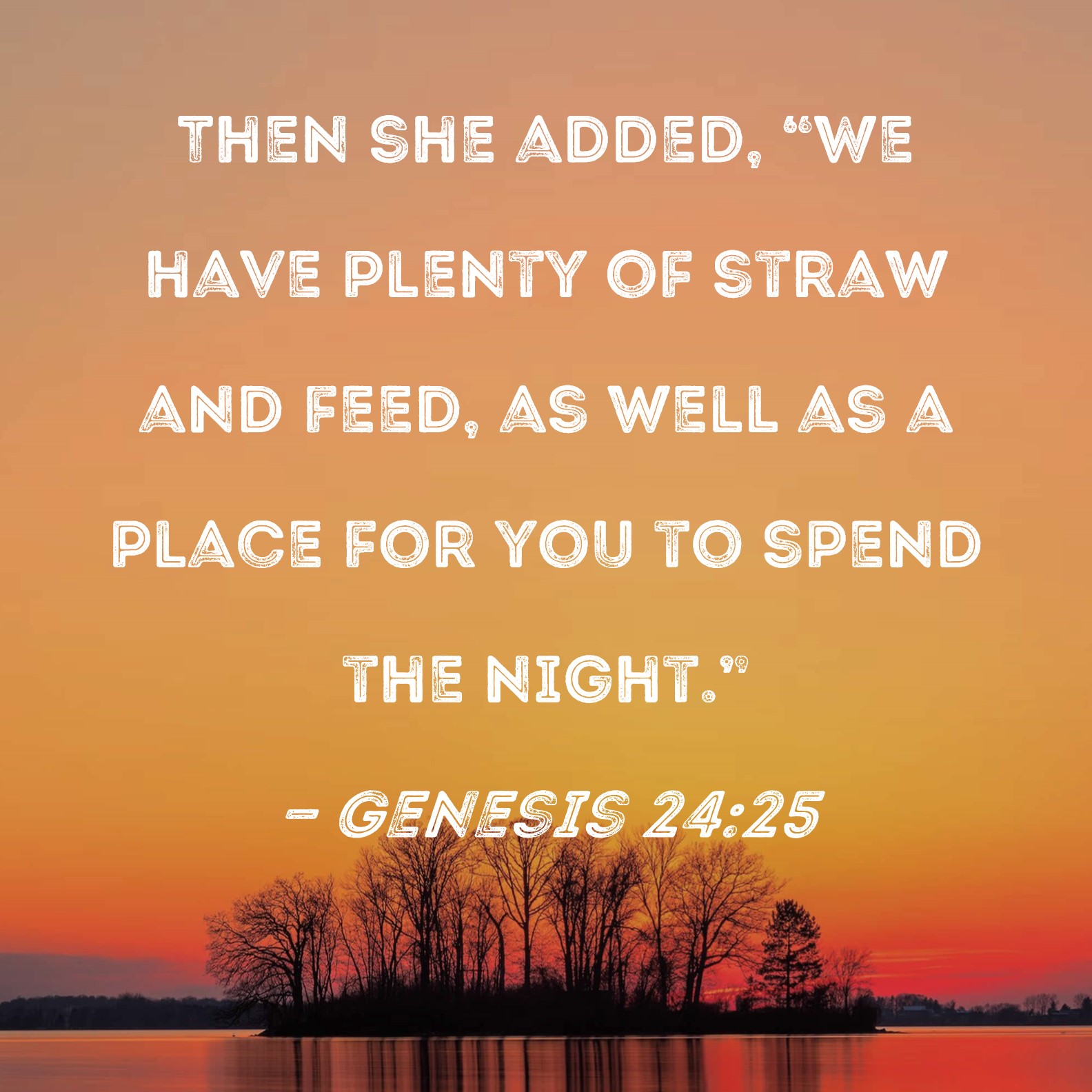 Genesis 24:25 Then she added, "We have plenty of straw and feed, as well as a place for you to spend the night."